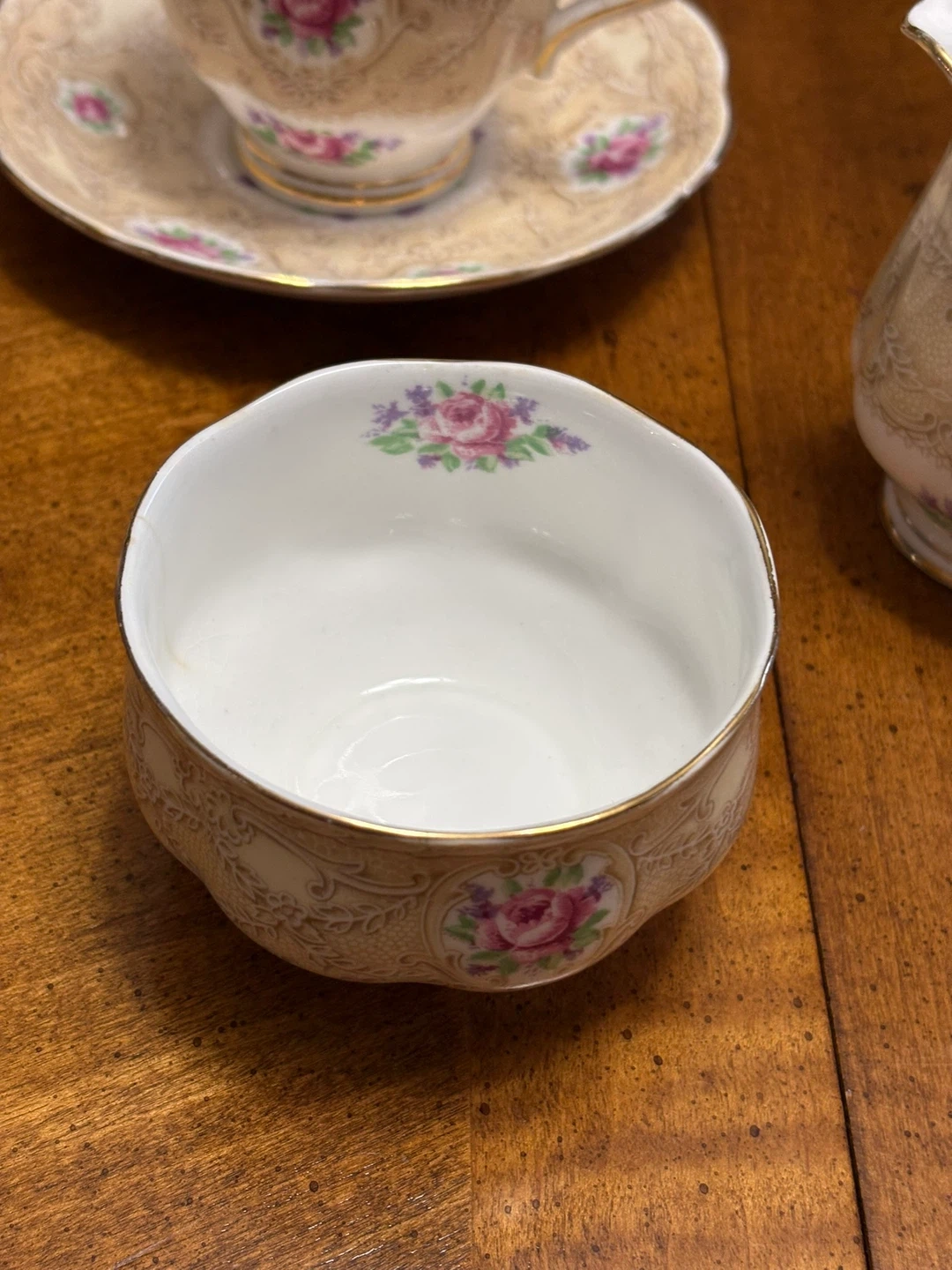 Royal Albert's Devonshire Rose collection. It's made of fine china and features a lovely floral pattern with gold trim.