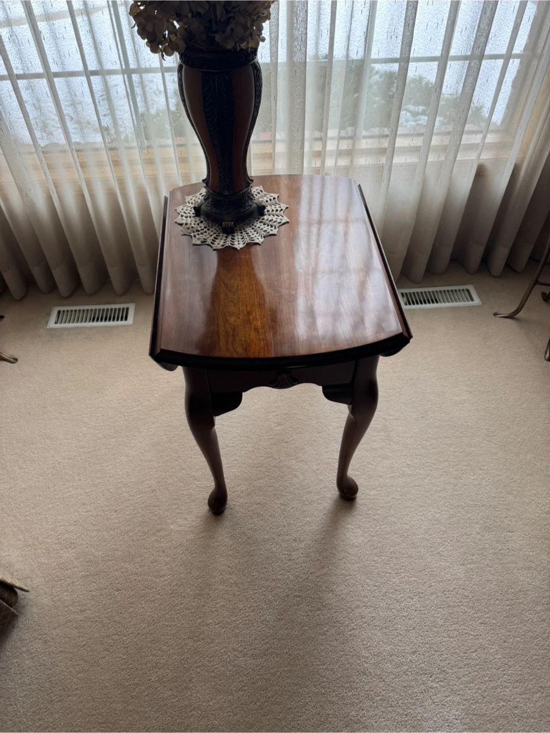 A charming wooden accent table with a glossy finish. Would like to sell together and not break them up.Lovingly cared for.