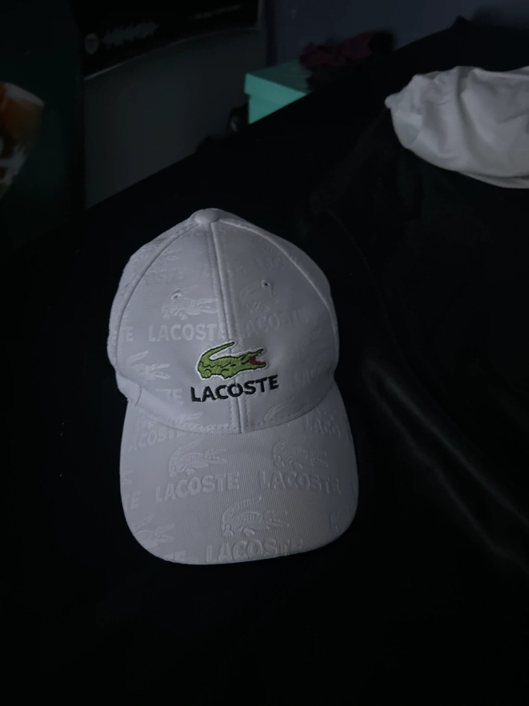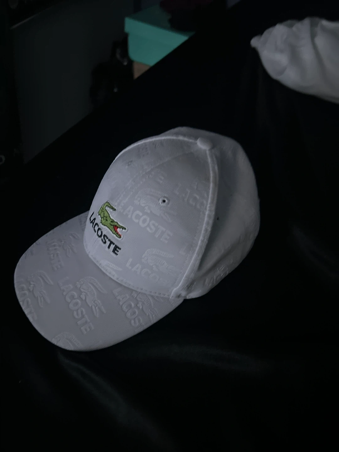 A stylish white baseball cap from Lacoste featuring an all-over embossed logo pattern. It has the iconic Lacoste crocodile logo embroidered on the front. This cap offers a classic fit and is suitable for everyday wear.
