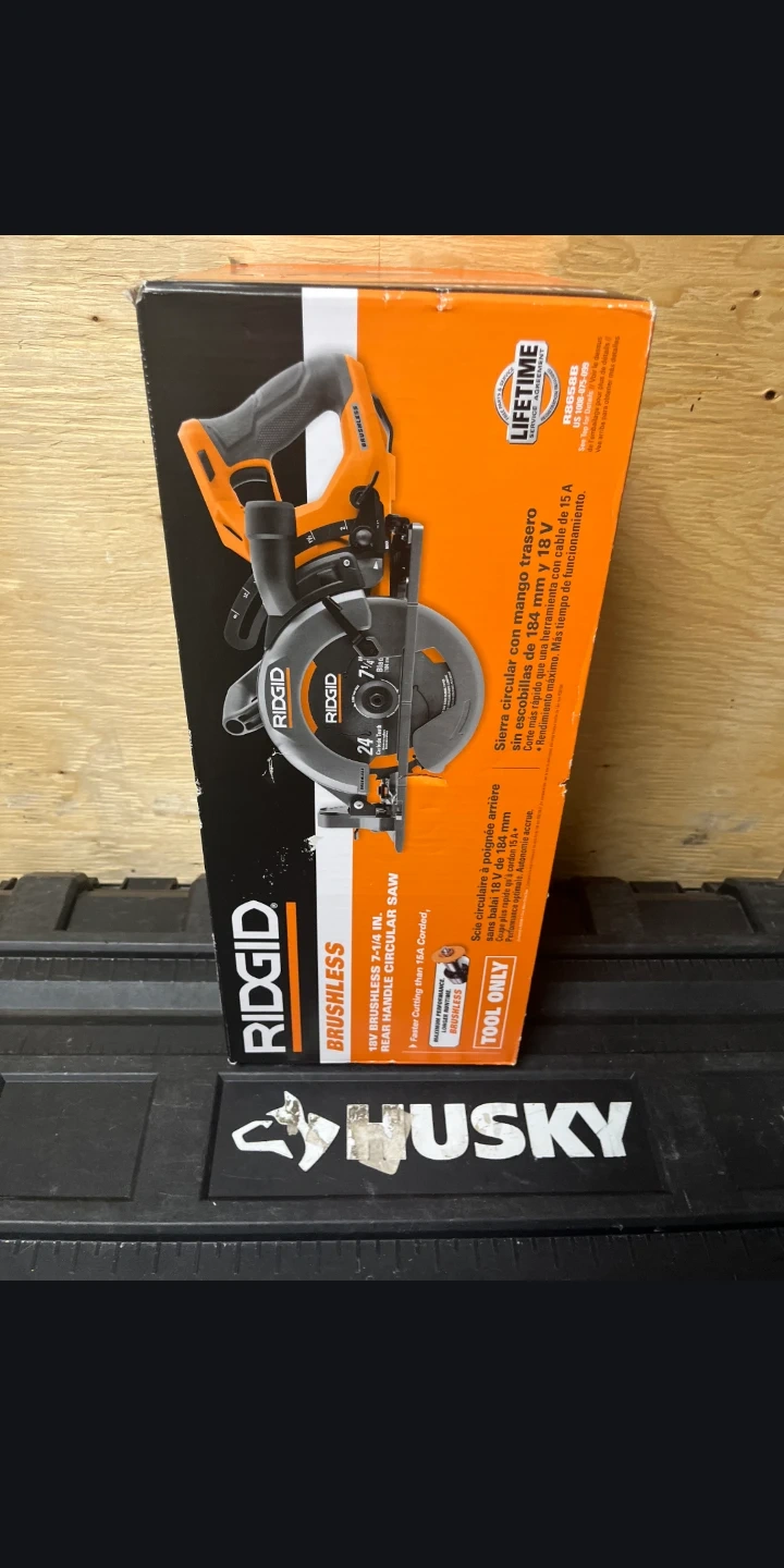 This is a RIDGID 18V brushless rear handle circular saw. It's a 7-1/4 inch saw. It offers faster cutting than a 15A corded saw. This is a tool-only item. Cash only