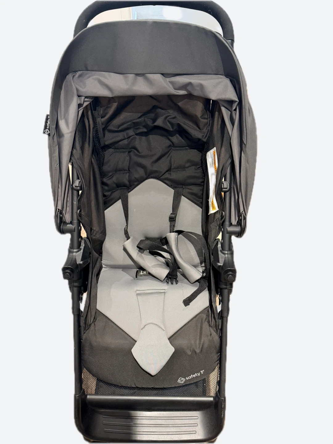 This is a Safety 1st lightweight stroller. It's a gray and black model with a 5-point harness and car seat (no base). It includes a storage basket at the bottom.