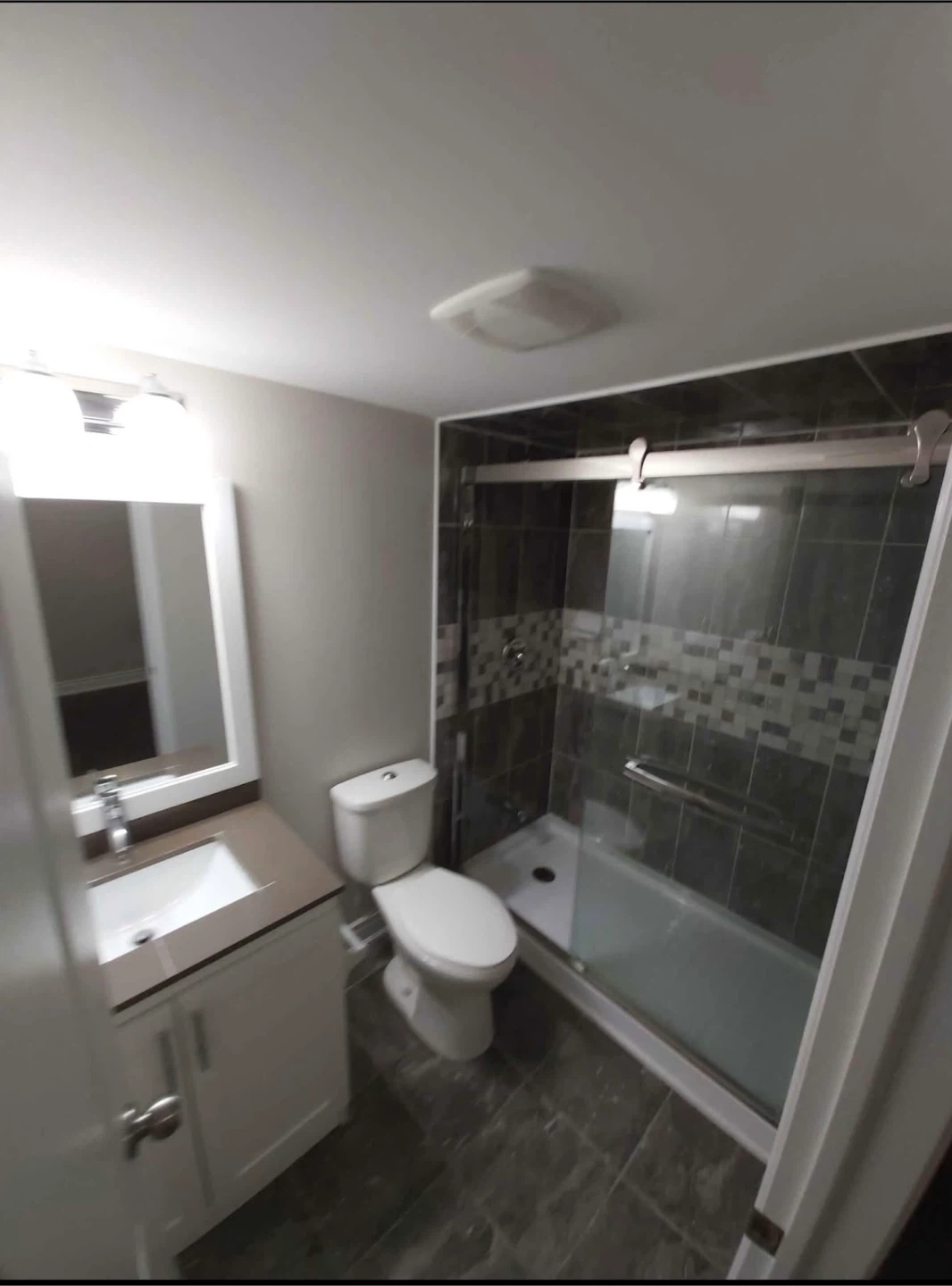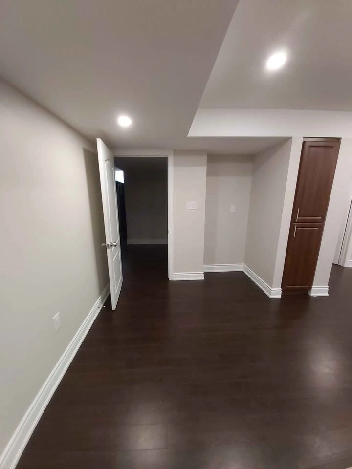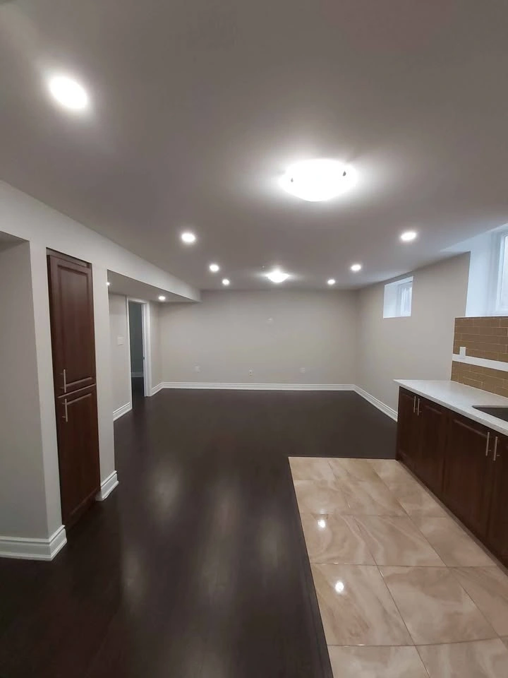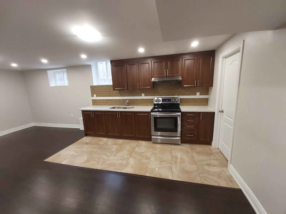 Features 2 large bedrooms with closets, 2 full bathrooms, a large kitchen, dining, and family area, separate laundry, and a separate entrance. Big windows provide lots of light, and the high ceiling has pot lights.