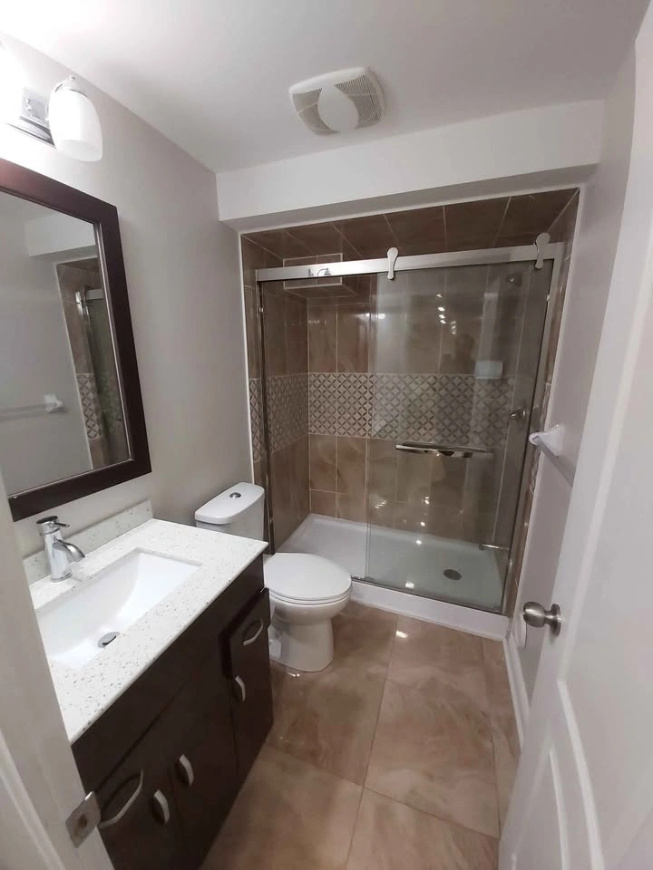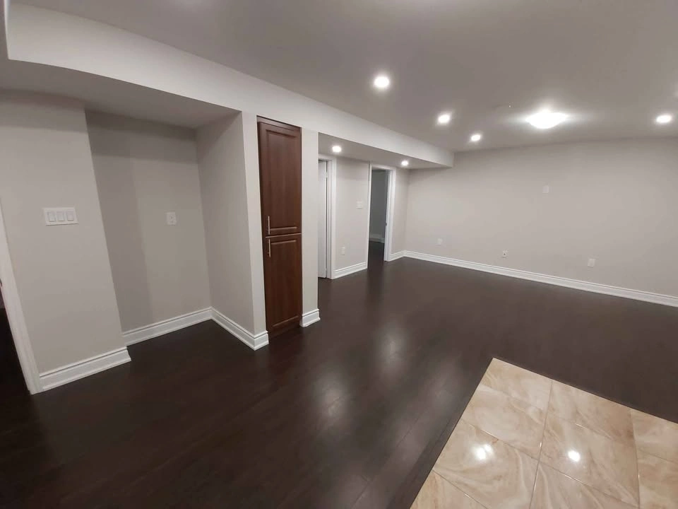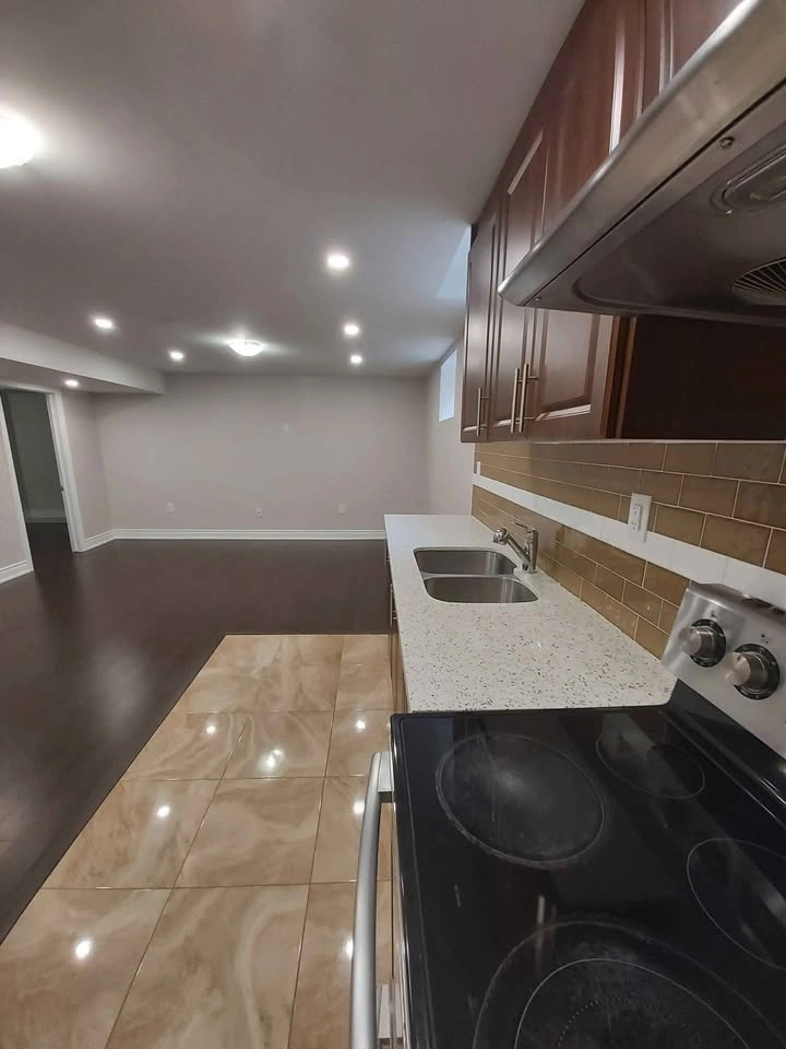 Features 2 large bedrooms with closets, 2 full bathrooms, a large kitchen, dining, and family area, separate laundry, and a separate entrance. Big windows provide lots of light, and the high ceiling has pot lights.