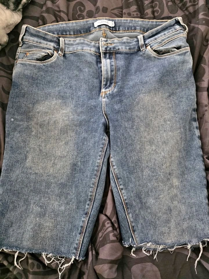 Great staple pair of medium-wash denim shorts by mySTYLE. They feature a trendy raw/frayed cut-off hem and comfortable stretch. Tagged as a size 12. A perfect everyday summer short that just isn't getting worn enough.