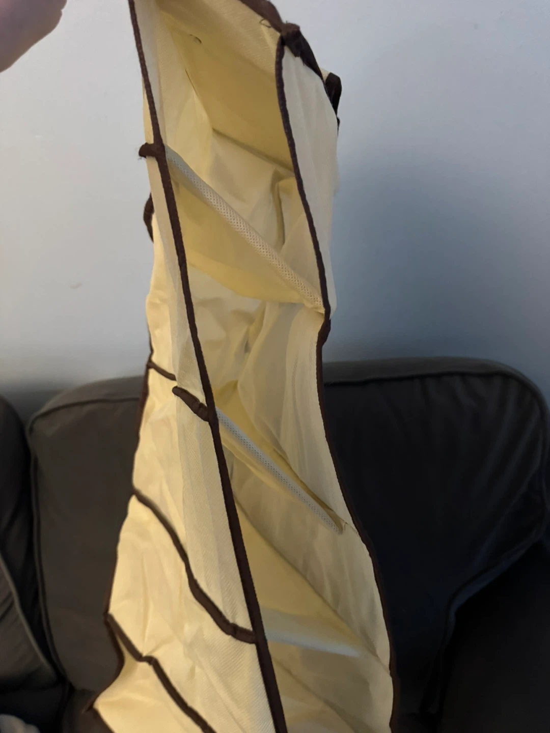 This hanging closet organizer is perfect for storing shoes or accessories. It's made of durable fabric and hangs from any closet rod. Several compartments provide ample storage space.