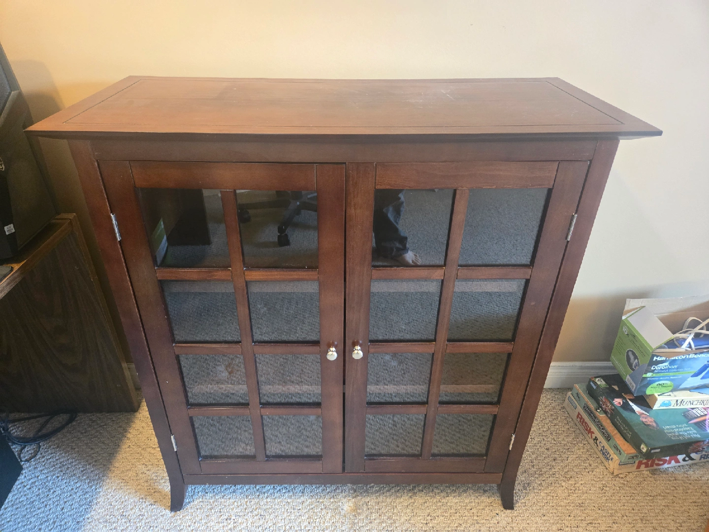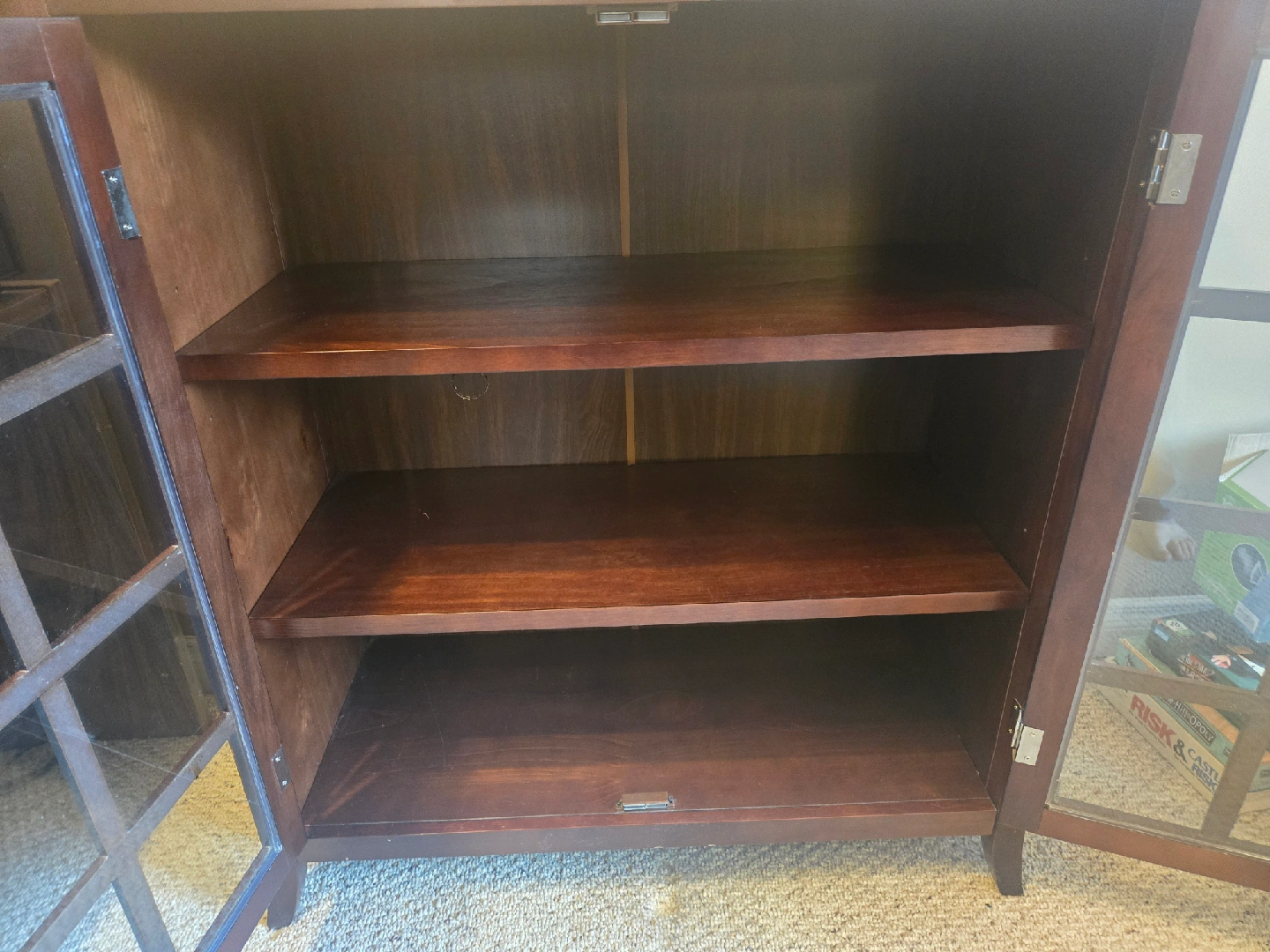 Selling a wooden cabinet with glass doors. It has a nice, classic look and would be great for storage or display. It has two shelves inside.