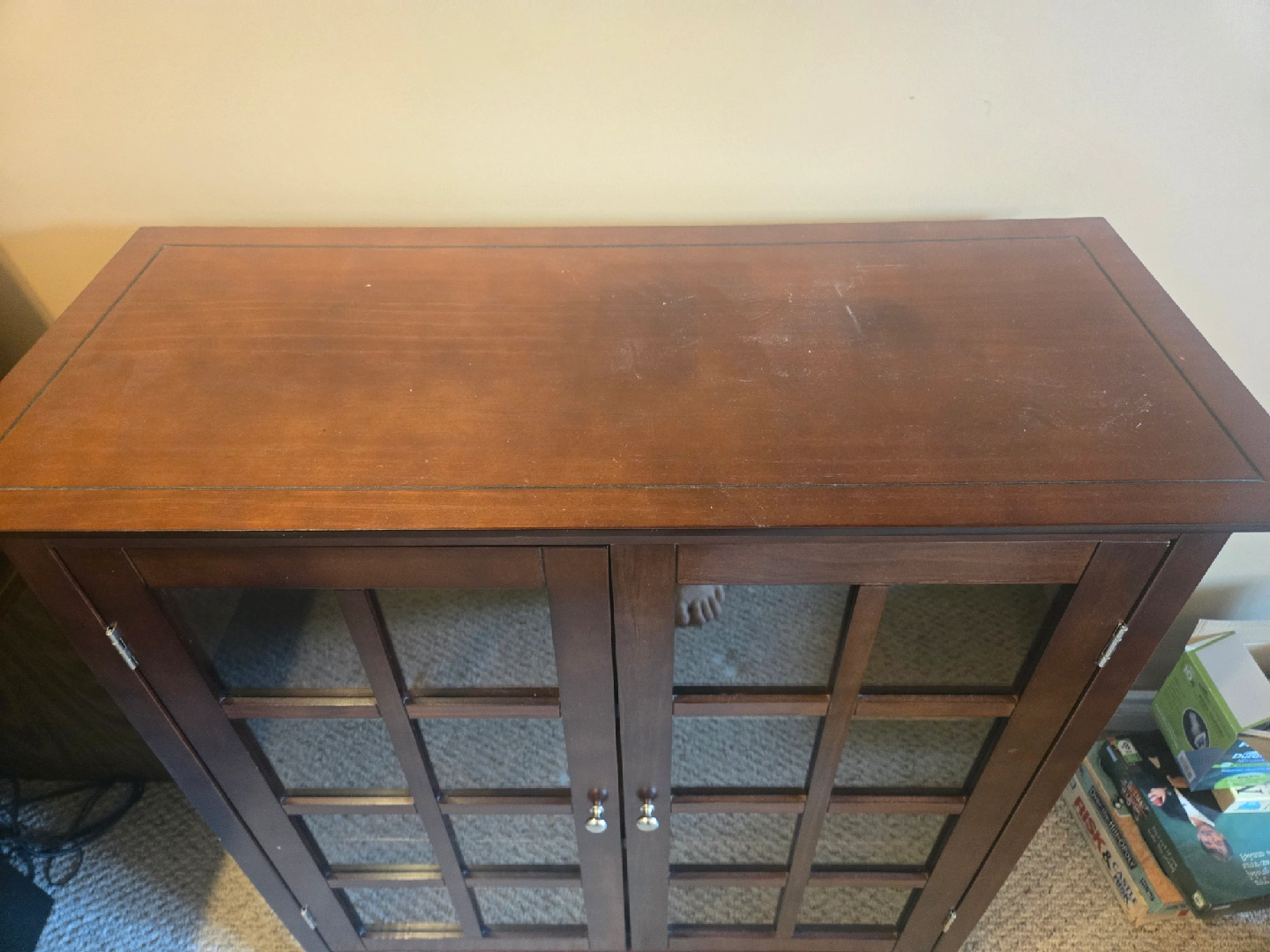 Selling a wooden cabinet with glass doors. It has a nice, classic look and would be great for storage or display. It has two shelves inside.