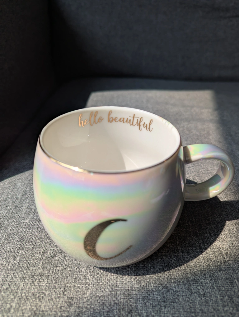 Add a touch of whimsy to your morning coffee or tea with this iridescent mug, adorned with a gold letter 'C' and 'hello beautiful' on the inside rim. This unique mug is in good (never used) condition and ready to brighten your day!