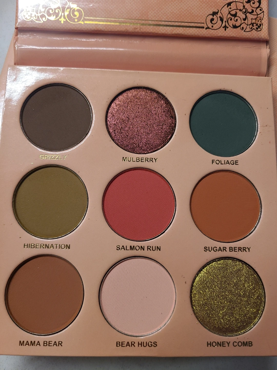Menagerie Arthurine eyeshadow palette. Features nine shades including Grizzly, Mulberry, Foliage, Hibernation, Salmon Run, Sugar Berry, Mama Bear, Bear Hugs, and Honey Comb.