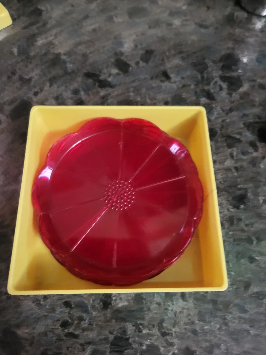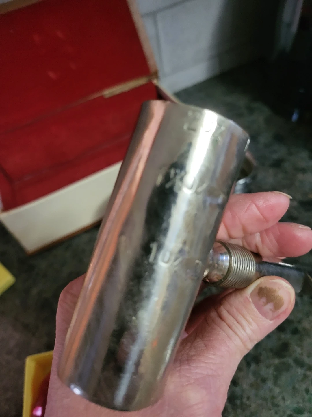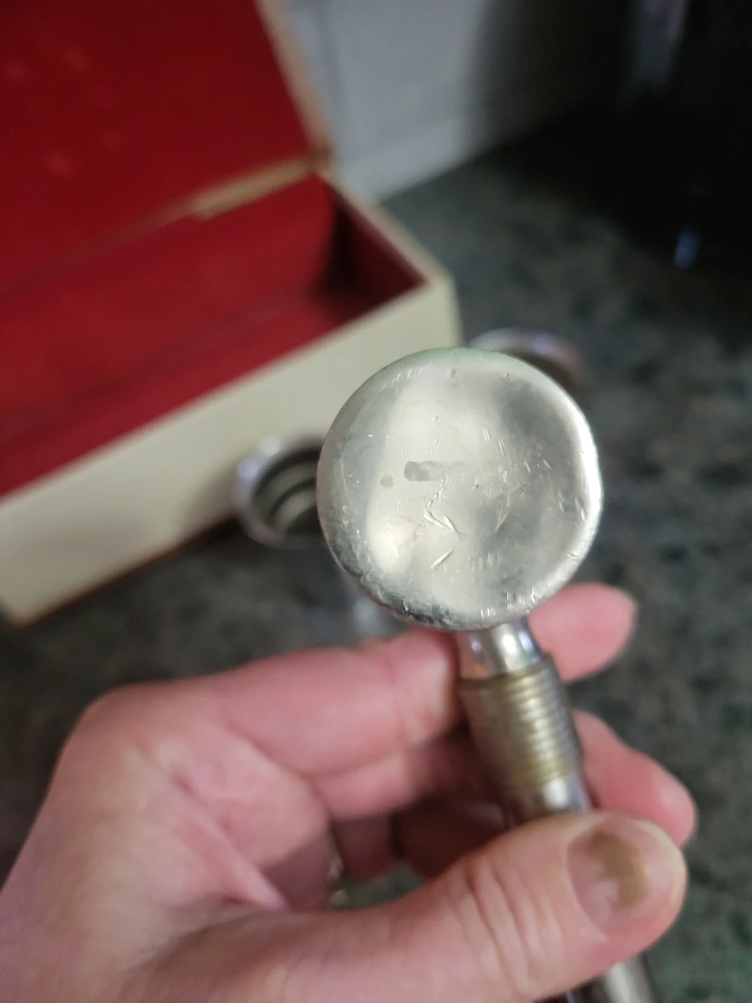This vintage bar set includes a set of four red coasters and a metal jigger with ounce markings. It comes in a storage box that's also perfect for display. A corkscrew and two small metal cups are also included.