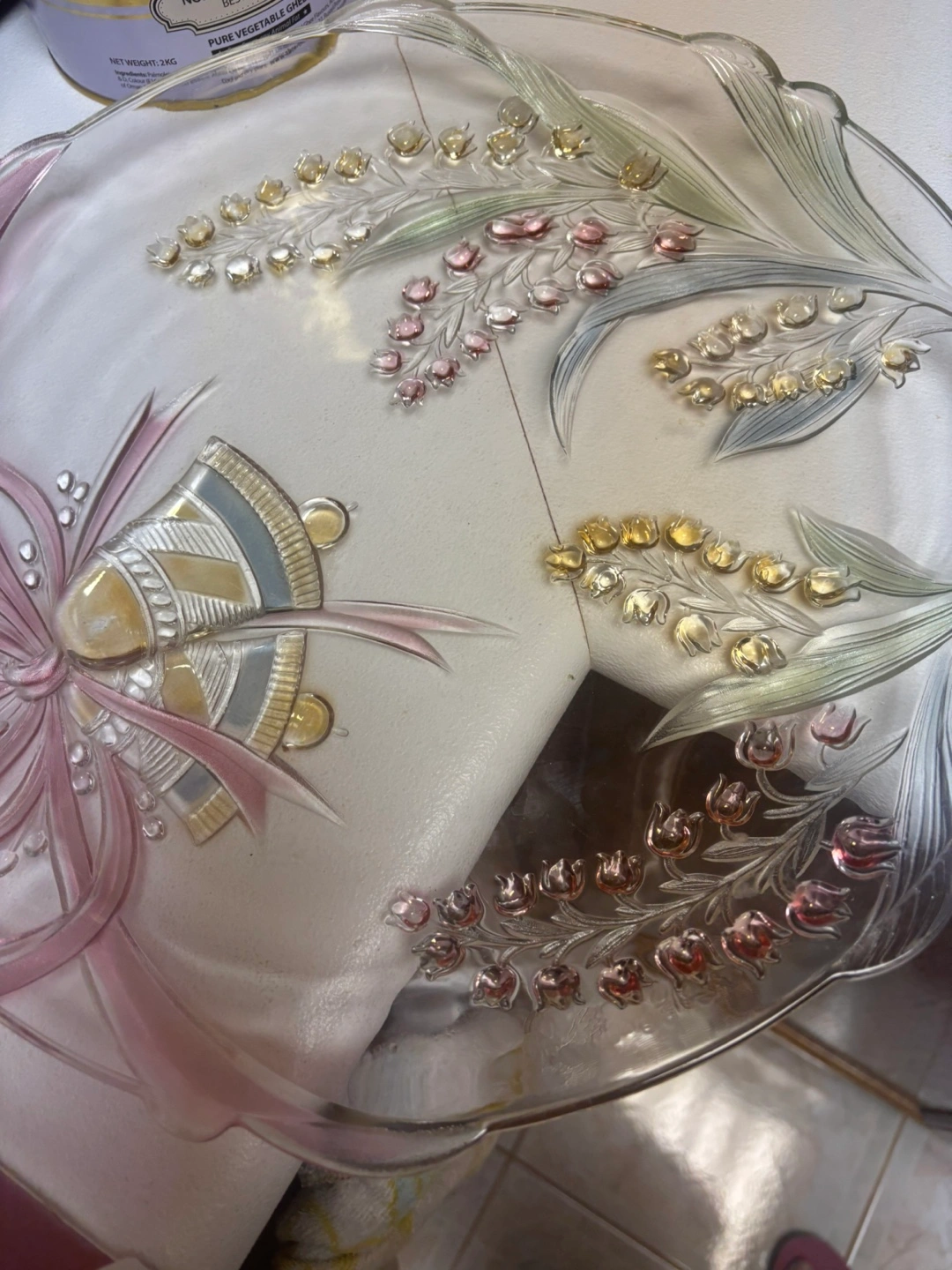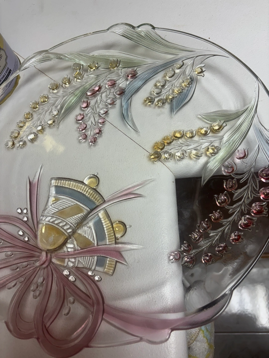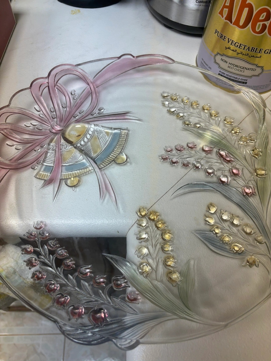 Pretty glass serving platter. Features embossed bells and flowers. Floral design. Clear glass with pink, yellow and green accents.