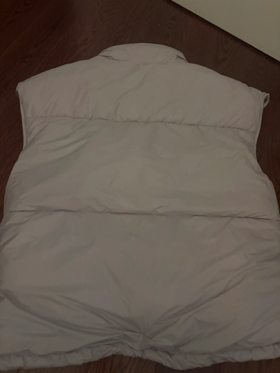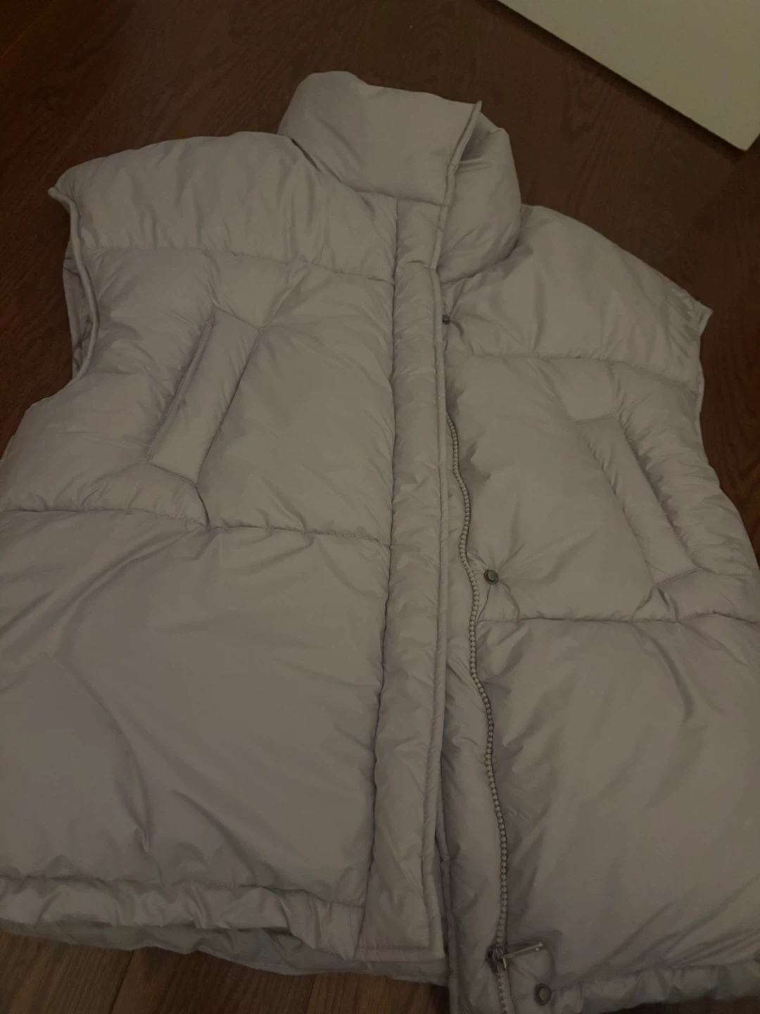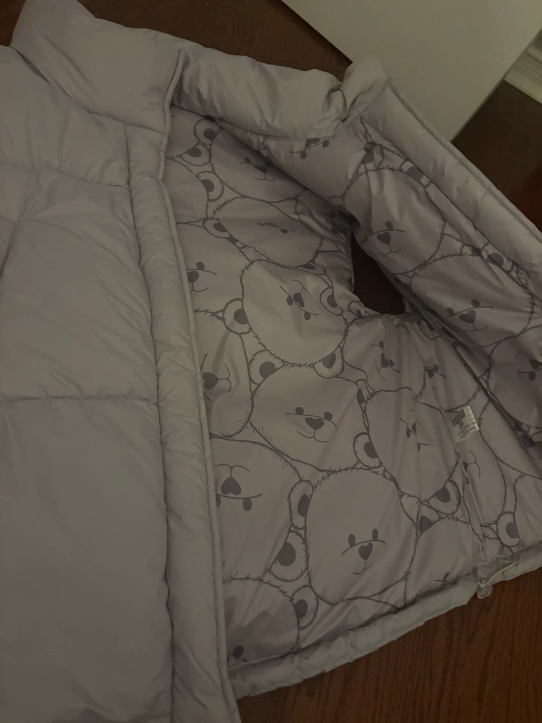 This light purple puffer vest has a fun teddy bear print lining. It's sleeveless with a stand-up collar and zipper closure. It's a great layering piece for cooler weather!