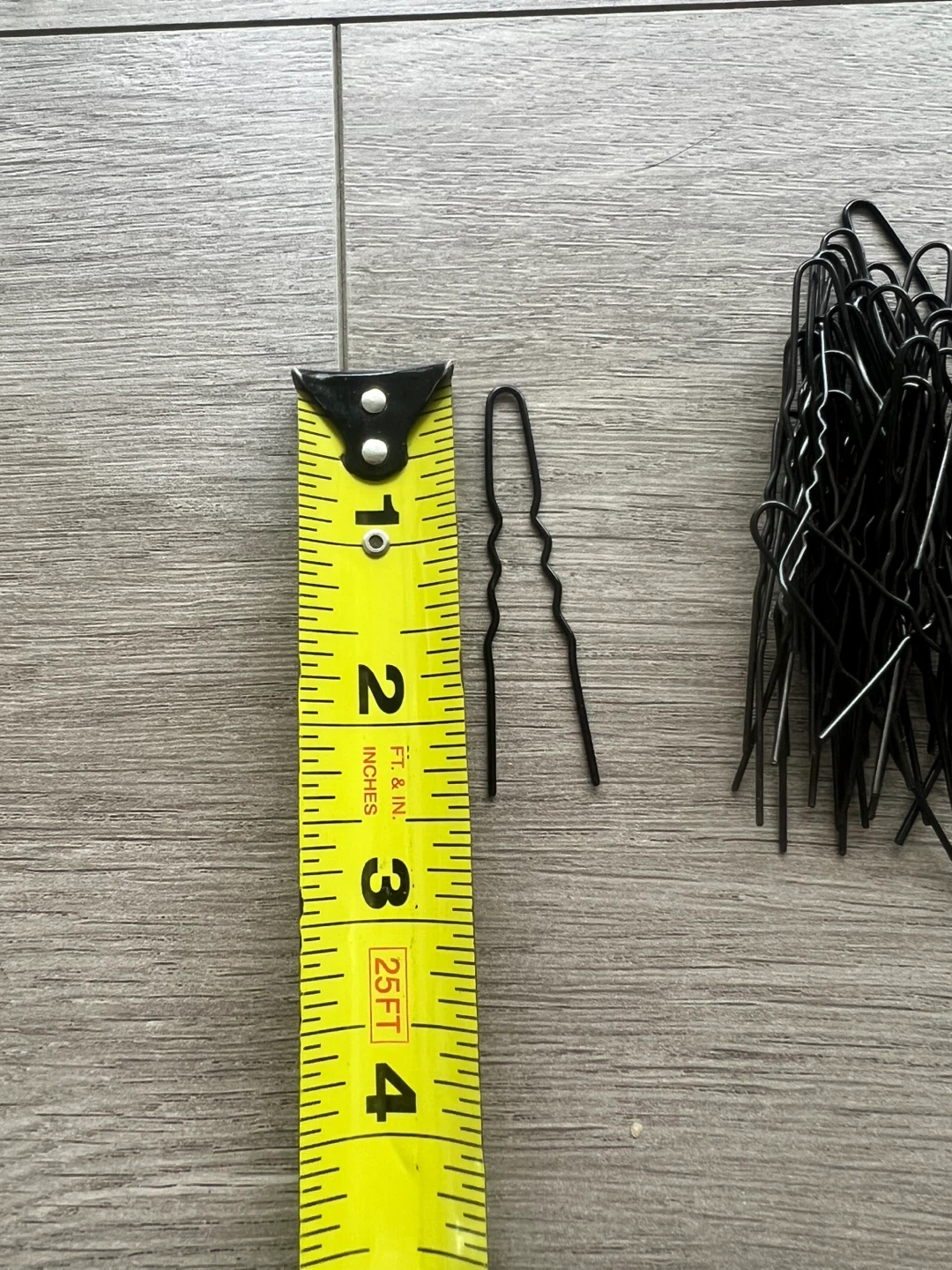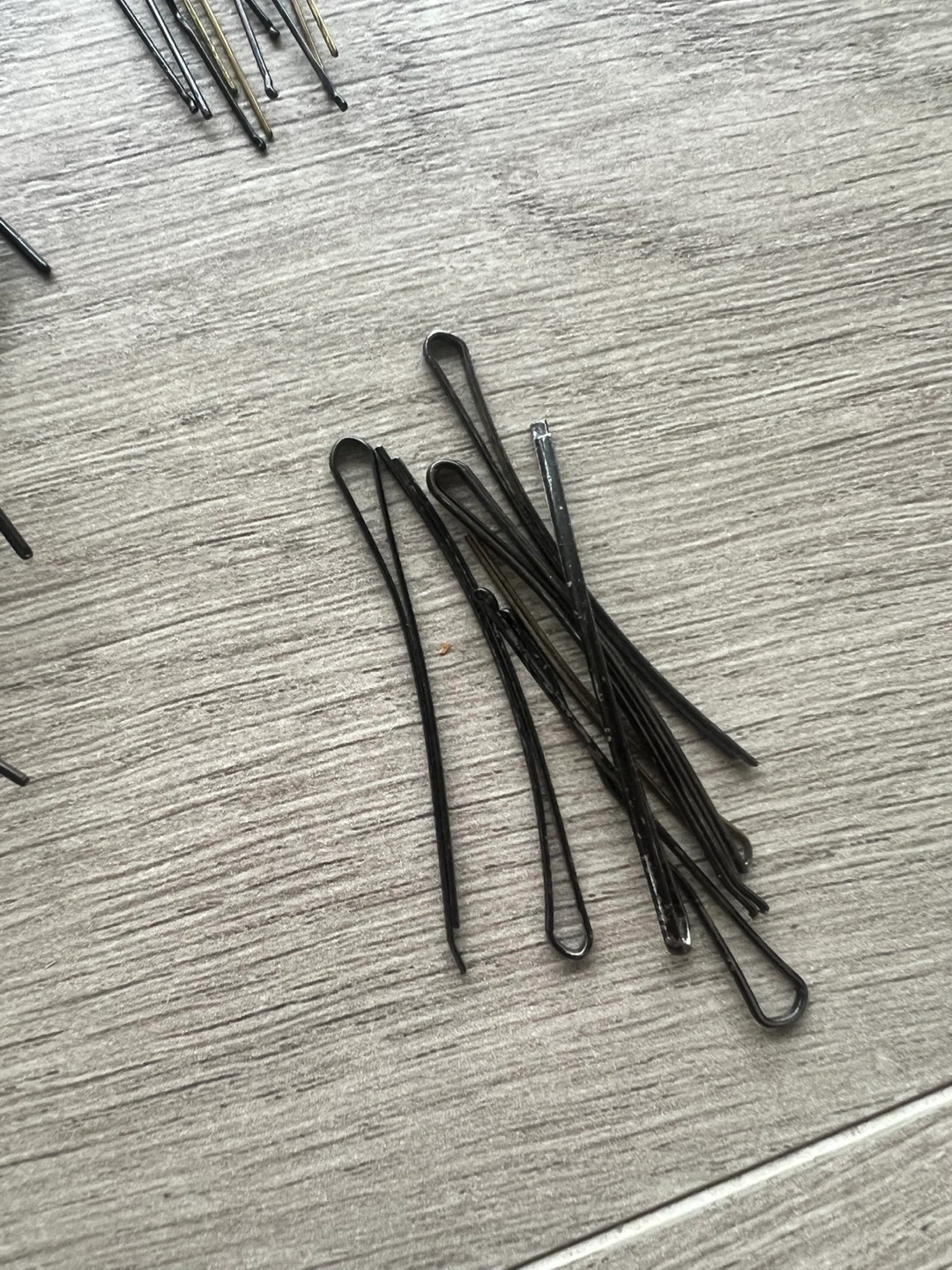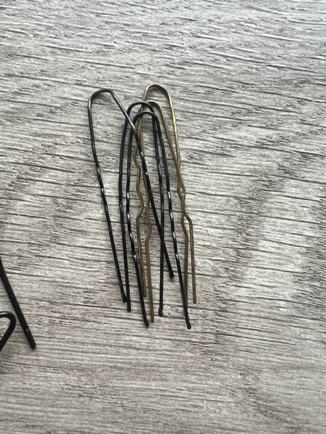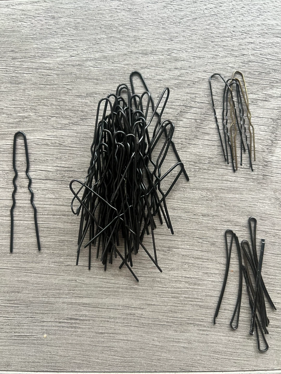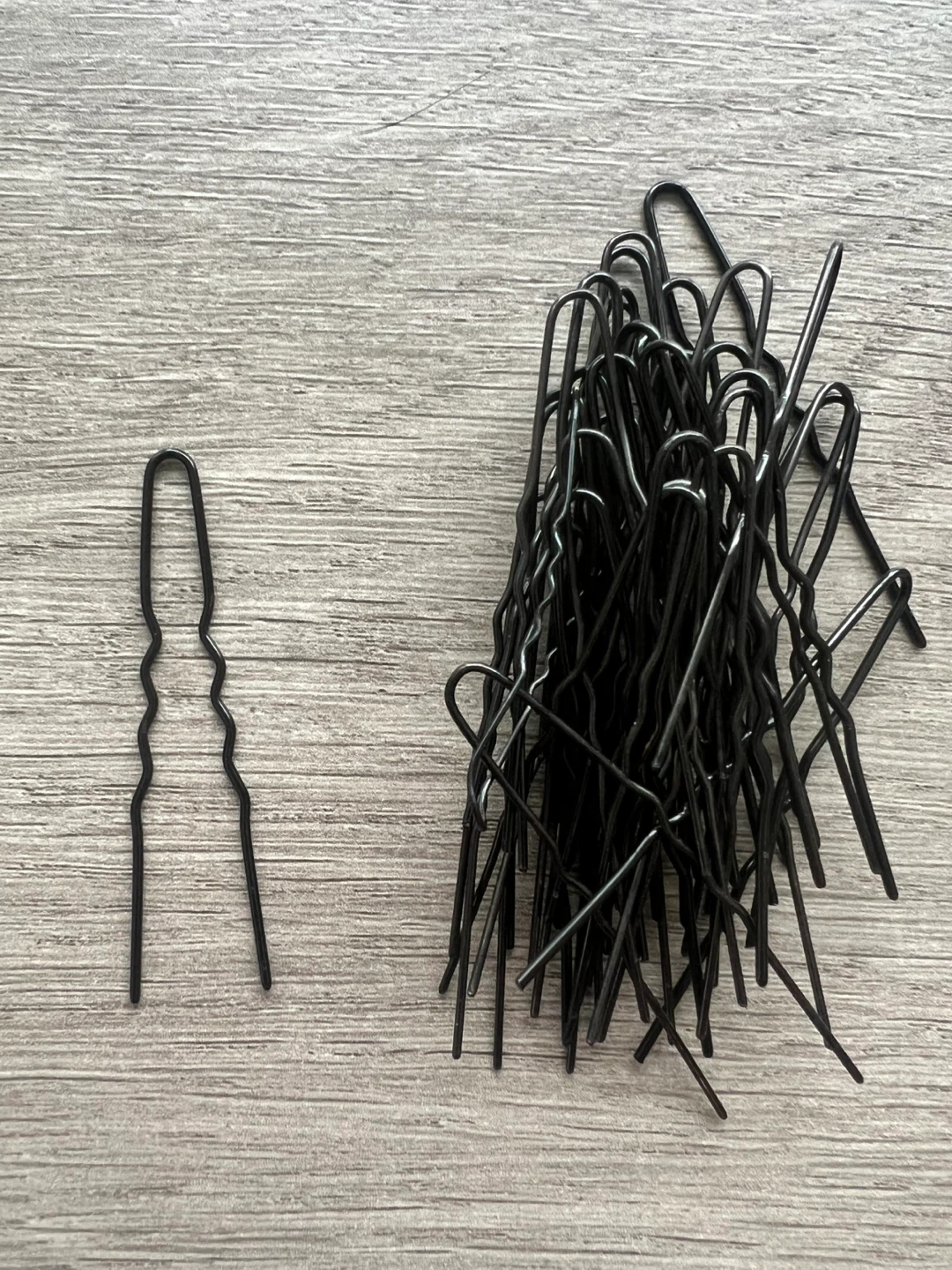 A mix of hair pins for styling. Includes some bobby pins and about 40 sturdy U-shaped pins. Black pins are approximately 2.5 inches long. Great for securing updos!