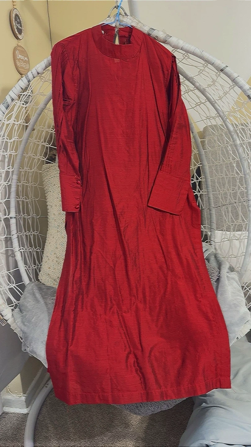 This is a red dress with a textured fabric. It has long sleeves with button details at the cuffs. The neckline is a high collar with a subtle keyhole detail at the back. It's suitable for various occasions.
