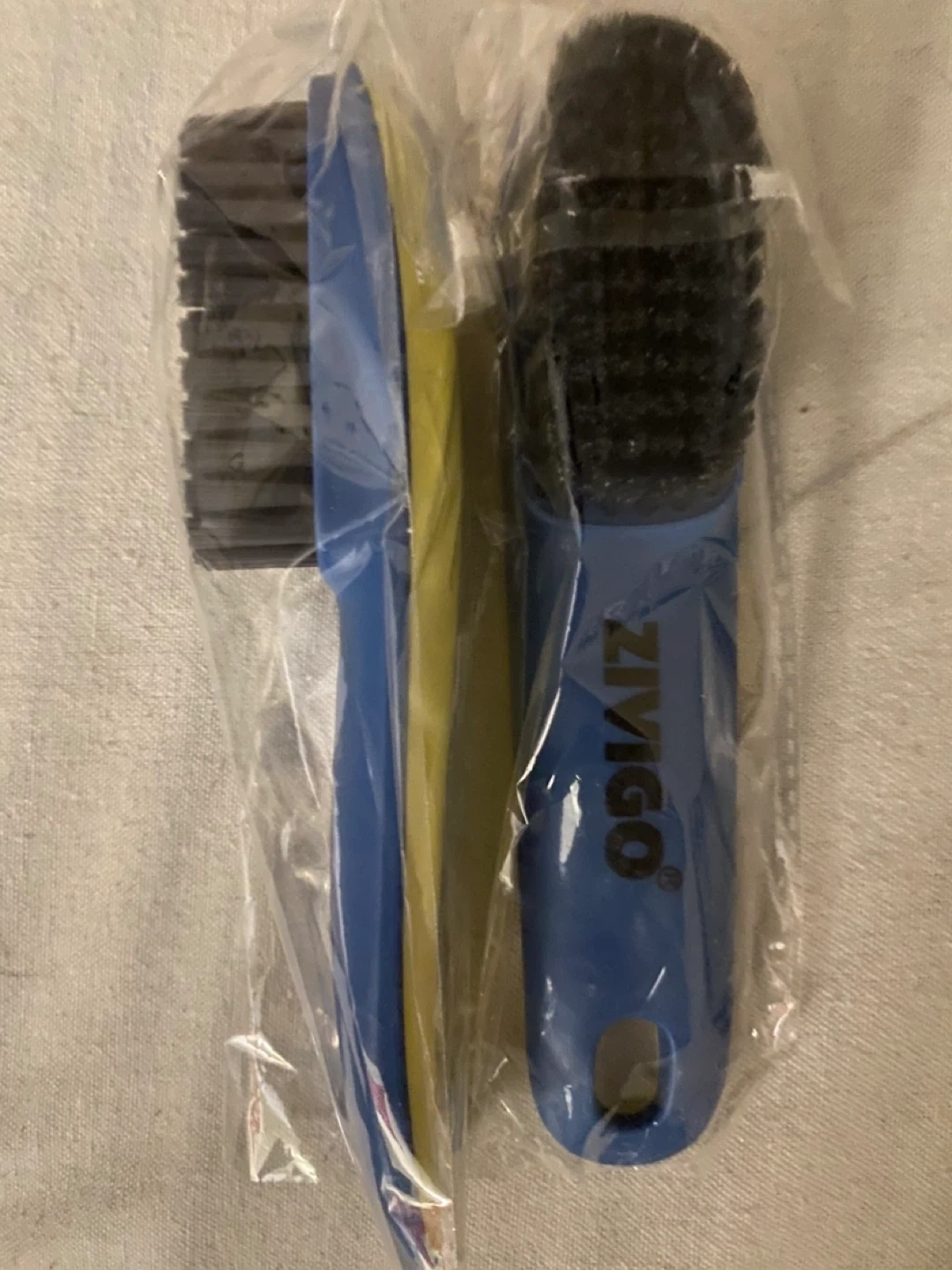 This is a set of two ZINGO shoe cleaning brushes. Each brush has a blue plastic handle and black bristles. They're great for cleaning sneakers and other footwear! The brushes are individually wrapped.