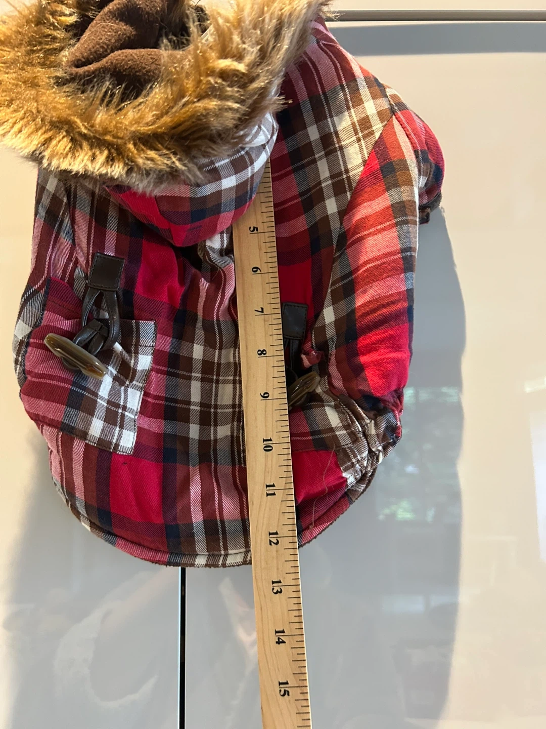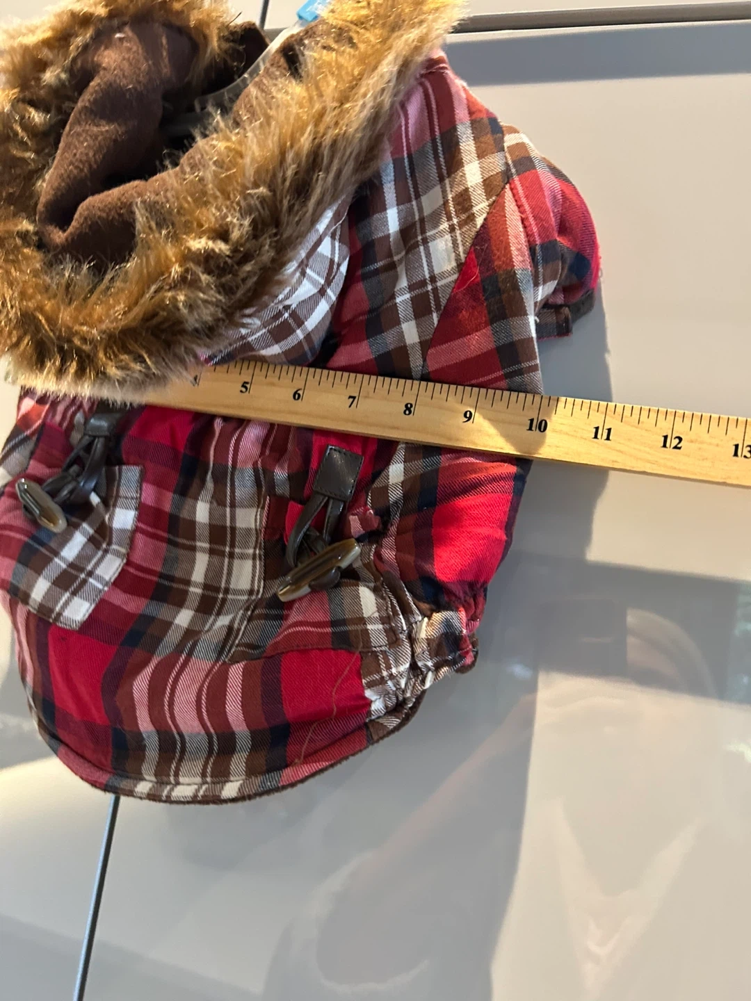 Here's a cute dog coat to keep your furry friend warm! It's a red plaid pattern with a faux fur hood.