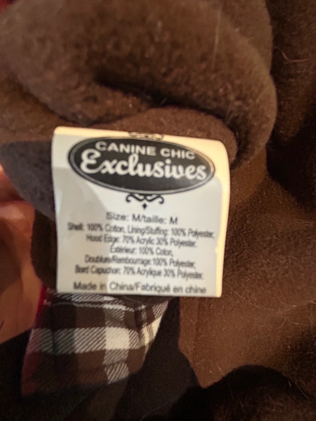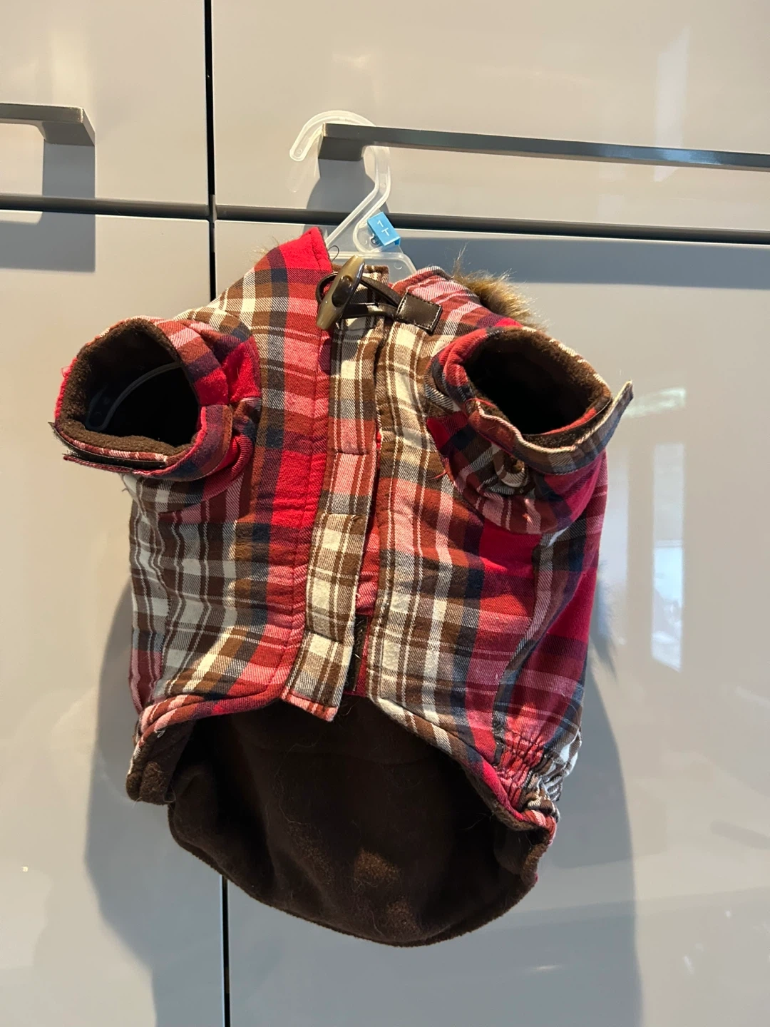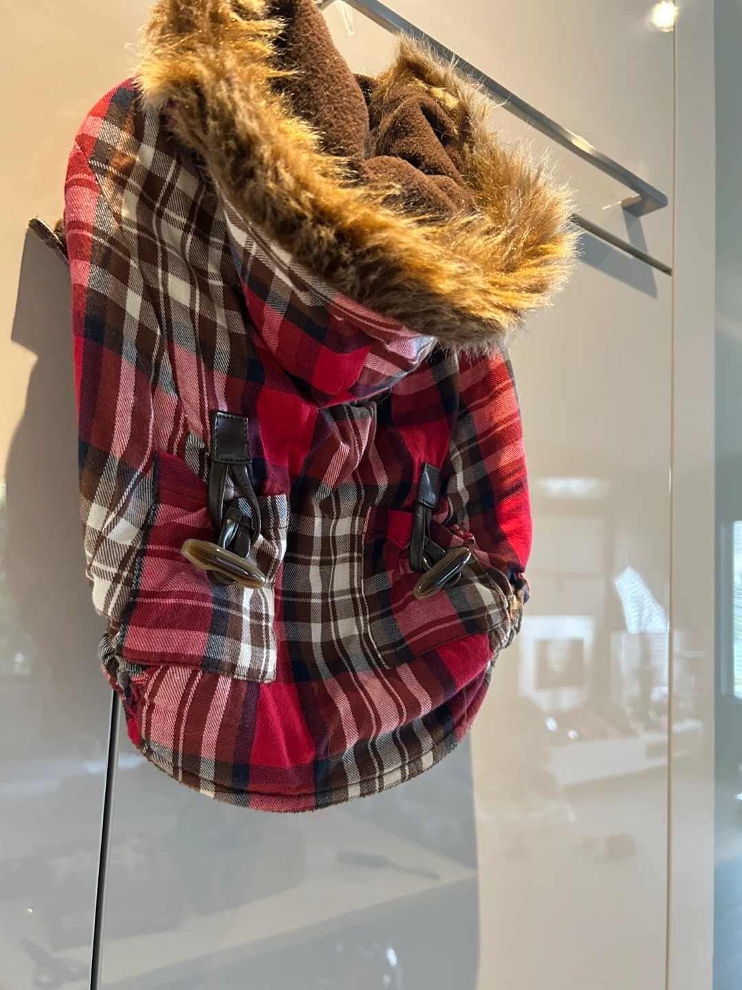 Here's a cute dog coat to keep your furry friend warm! It's a red plaid pattern with a faux fur hood.