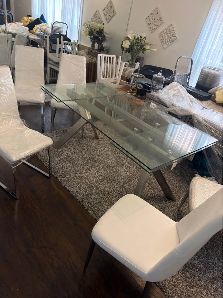 Glass expandable dining table with 6 white leather chairs (retail $1500) mint condition! Ext to 95”. LOTS of items for sale. Check out other listings. Deals for multiple items. Buy from a highly rated seller! CASH only. Pickup or can be delivered for a fee.