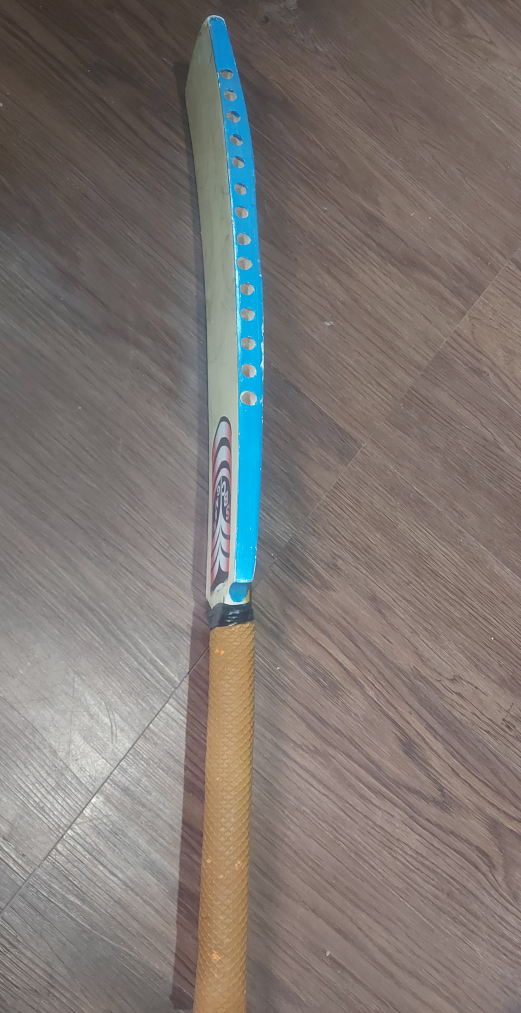 Selling a used cricket bat. It has a brown grip and some colourful designs on the blade. Good for recreational play!