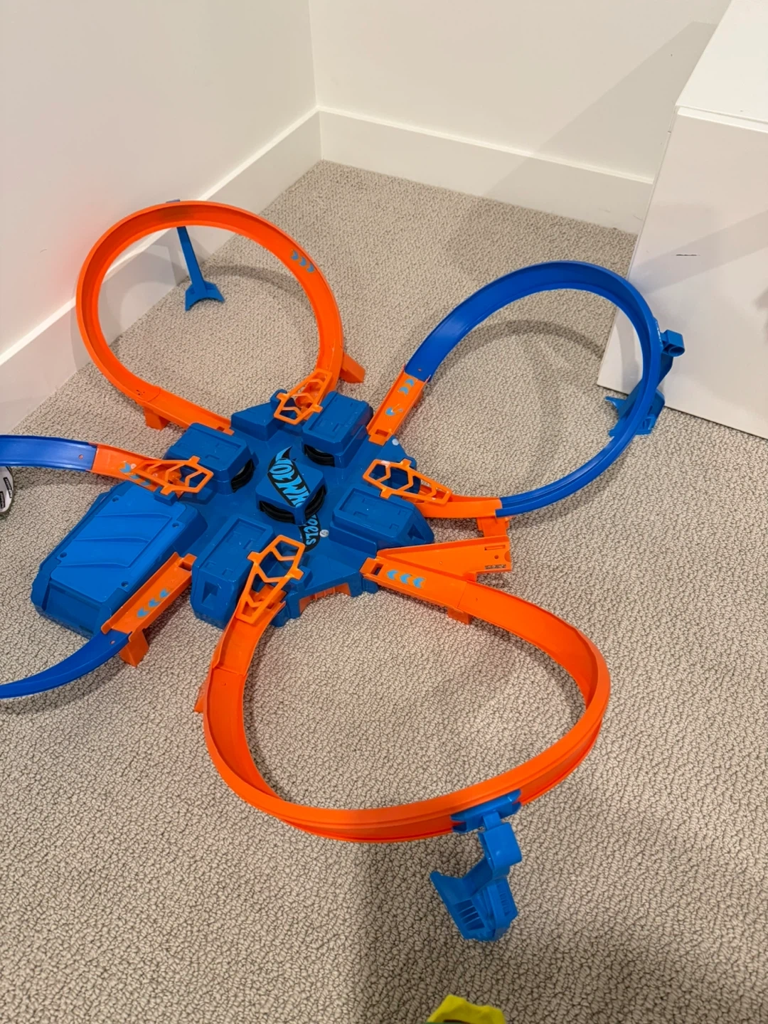 Hot Wheels Track Builder Stunt Box playset! It's a blue and orange plastic track set with multiple loops and connectors. This toy is great for creating exciting car stunts and races.