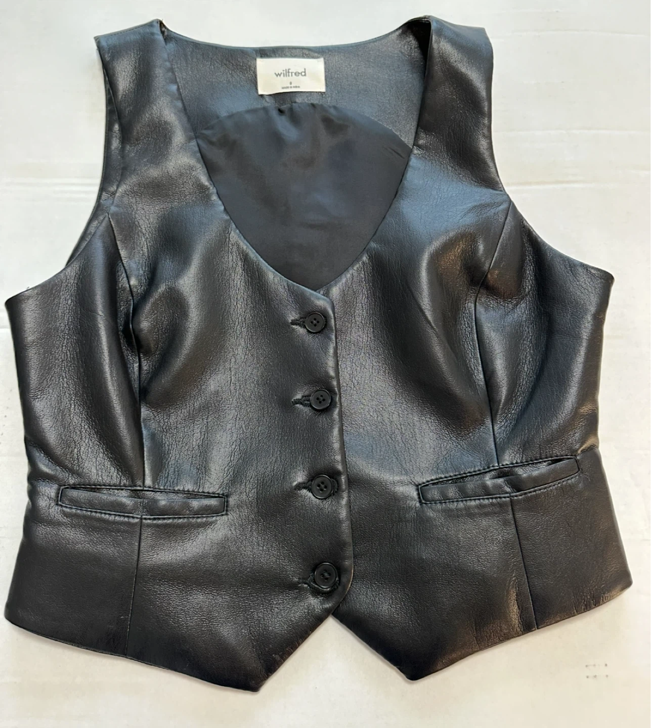 Selling a Wilfred black faux leather vest in size 8. It's in great condition and made of 100% polyurethane face, 100% polyester back, and 100% cupro lining. Perfect for adding a stylish touch to any outfit!