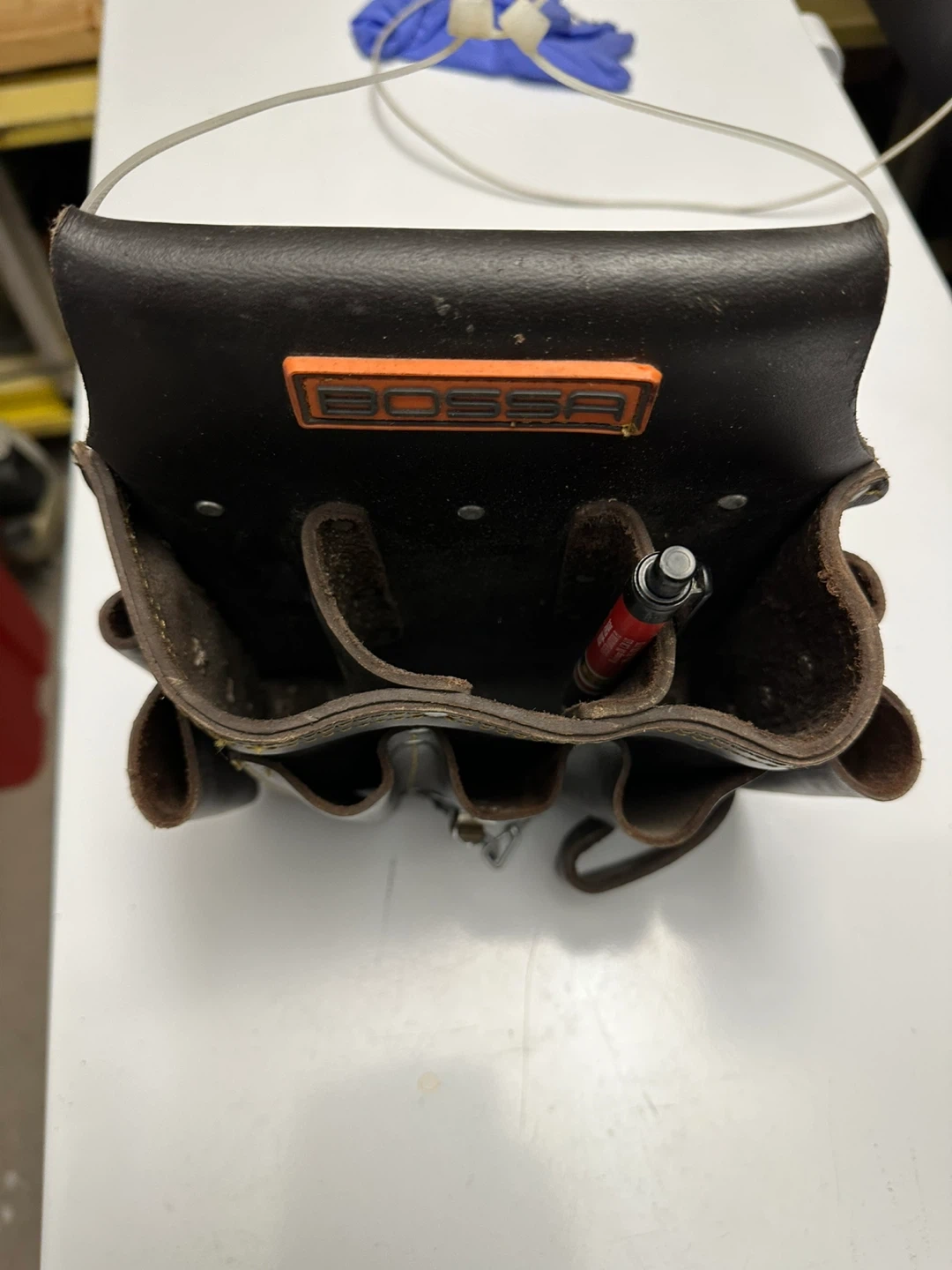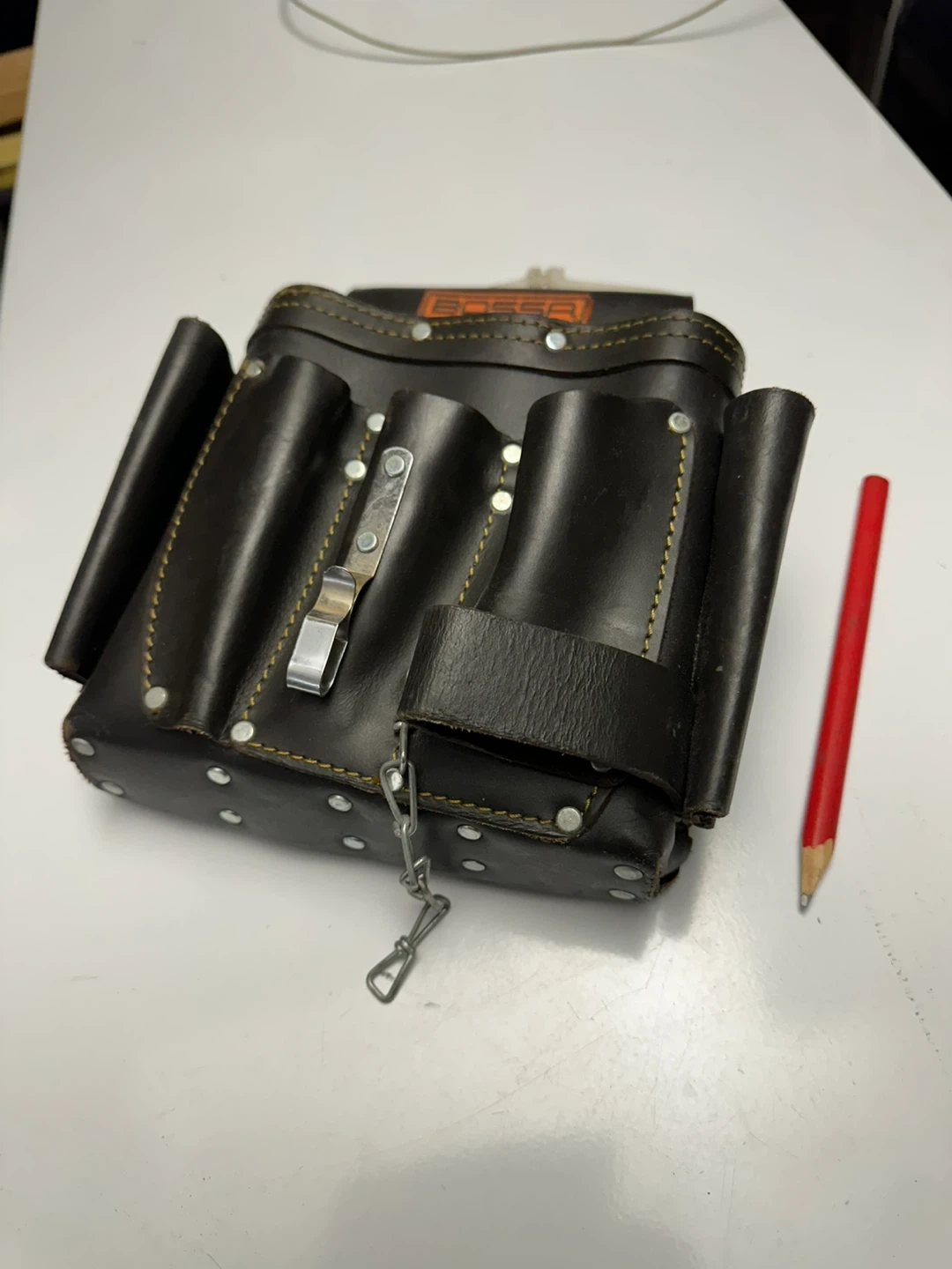 BOSS A leather tool belt pouch with multiple pockets and loops for organizing tools. Durable leather construction. Includes a hammer holder loop and a clip for attachment to your belt.