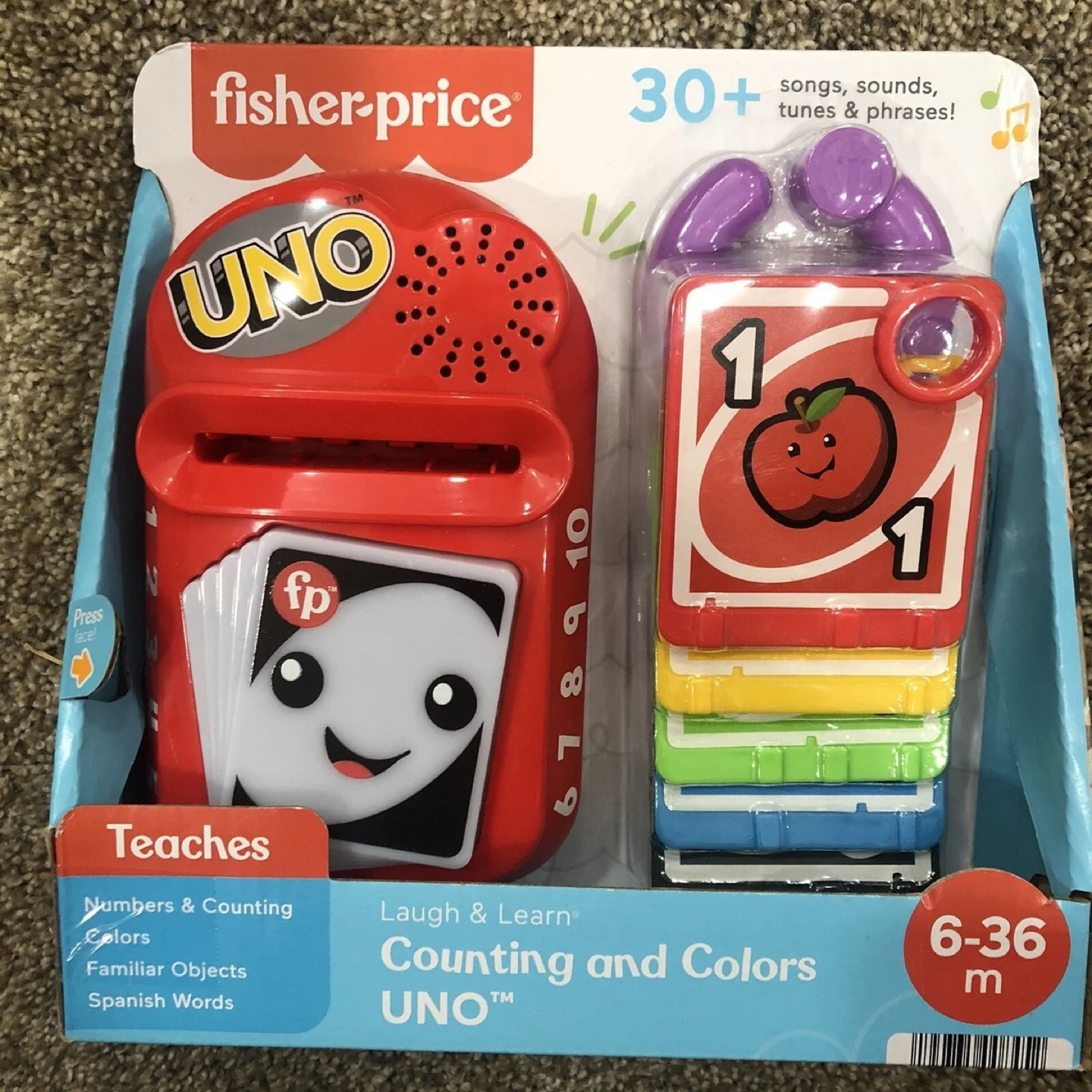 Brand new, sealed packaging and completely giftable. Fisher Price Baby Uno toy. Teaches counting and numbers, with 30+ sounds, songs and phrases. Purchased as a gift, and recieved duplicates.