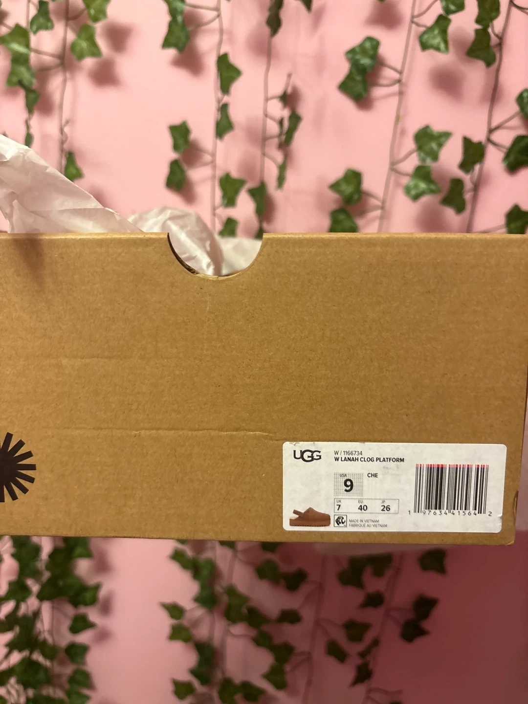 Brand New UGG W Lana Clog Platform shoes are in a size 9 and come in a chestnut colour. They're made with a suede-like material and feature a comfortable platform sole. The original box is included!