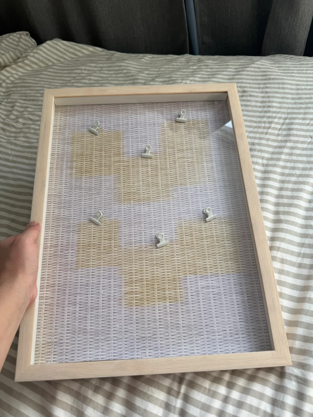 This wooden frame display board is perfect for showcasing photos or notes. It comes with several clips to hold your items securely. It's a stylish way to add a personal touch to any room!
