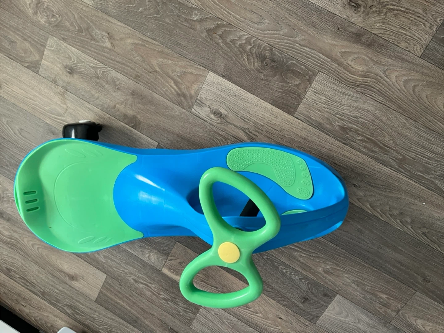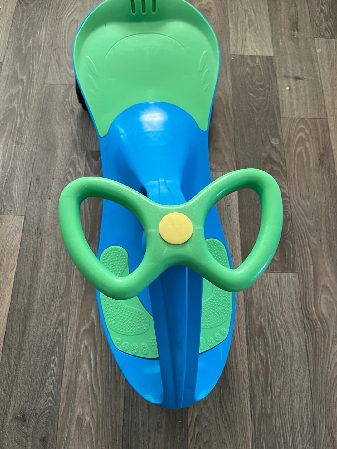 This kids' ride-on wiggle car is blue and green. It features a steering wheel and footrests for easy play. Great for outdoor fun and developing balance!