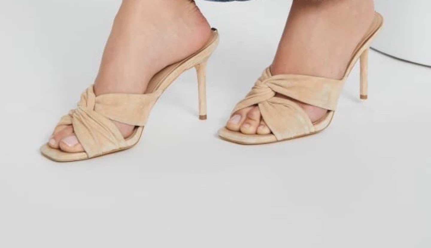 Stylish Guess mules with a knotted twist detail. These open-toe heels feature a comfortable suede material. Heel height appears to be approximately 3-4 inches. Perfect for dressing up or down!