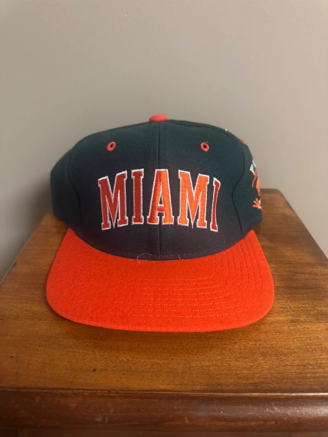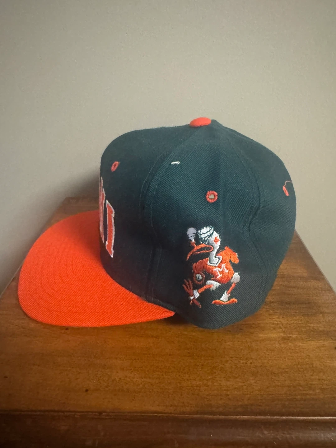 This vintage 90s Starter snapback hat features the Miami Hurricanes logo and text. It's a fitted hat with a green and orange colour scheme. This cap is perfect for any fan!