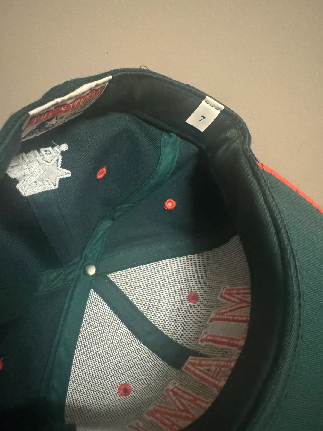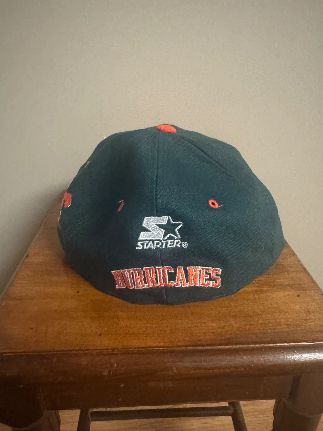 This vintage 90s Starter snapback hat features the Miami Hurricanes logo and text. It's a fitted hat with a green and orange colour scheme. This cap is perfect for any fan!