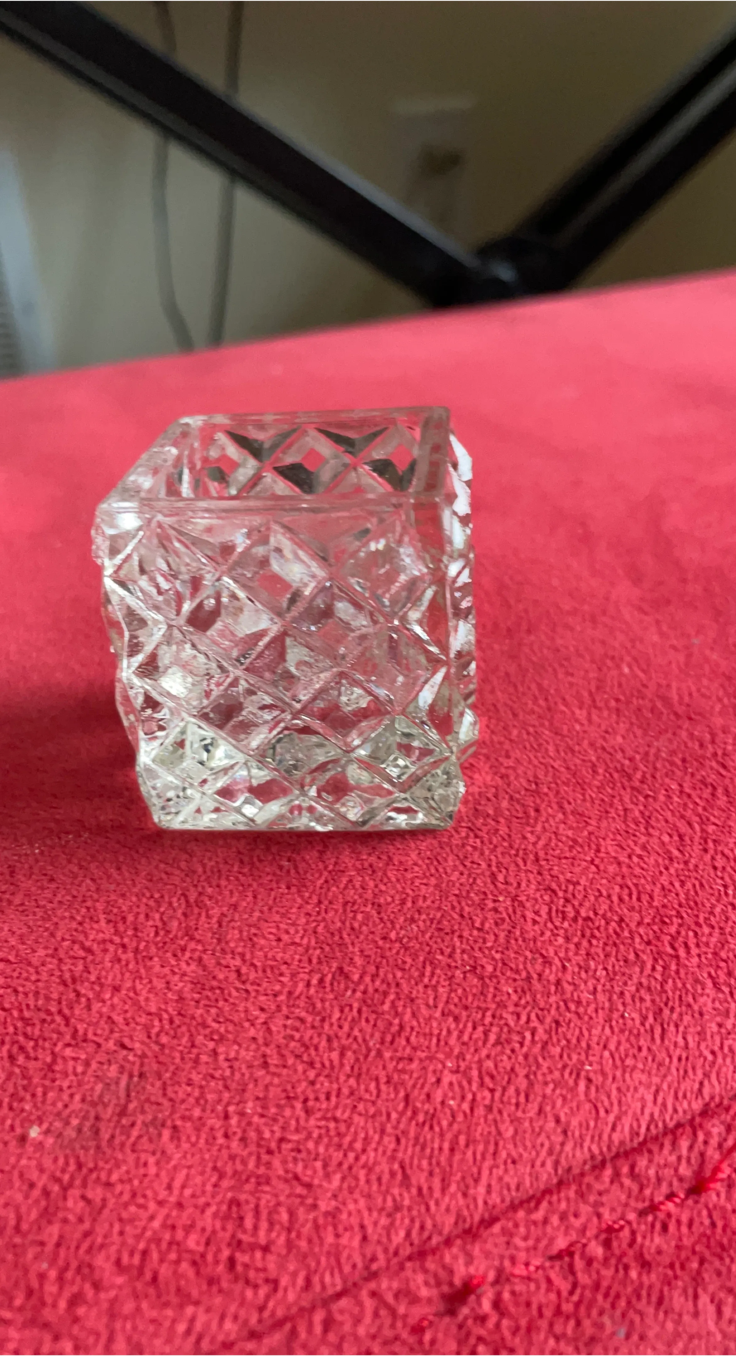 Small square dish made of clear, textured glass. It's perfect for holding small trinkets or as a decorative accent piece. Glass material.