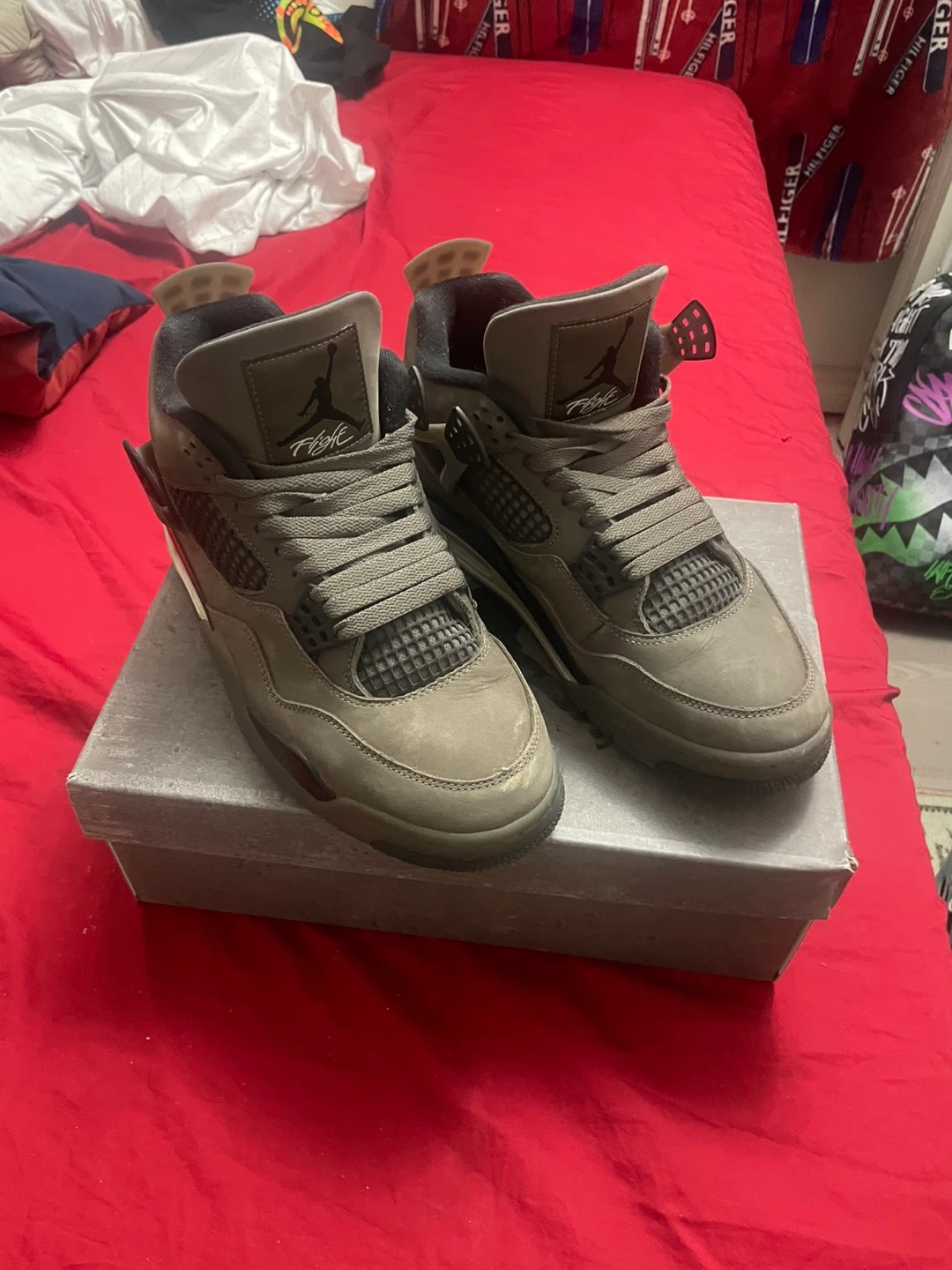 These Air Jordan 4 Retro sneakers come in a "cave stones" colourway. They feature a nubuck upper with black accents and the iconic Jumpman logo. Includes original box.