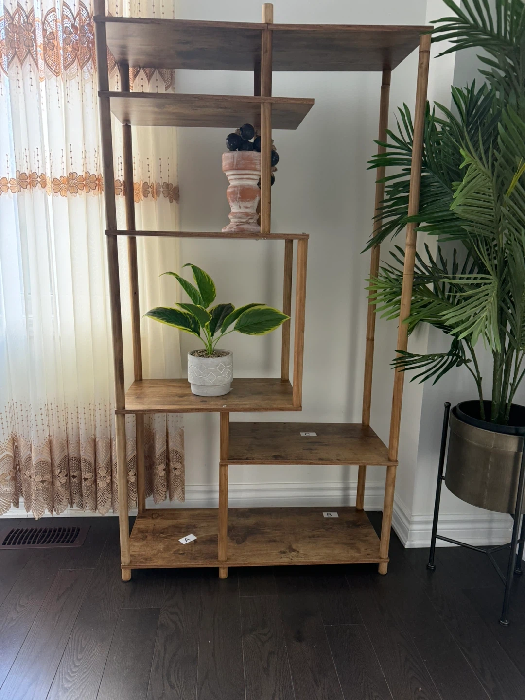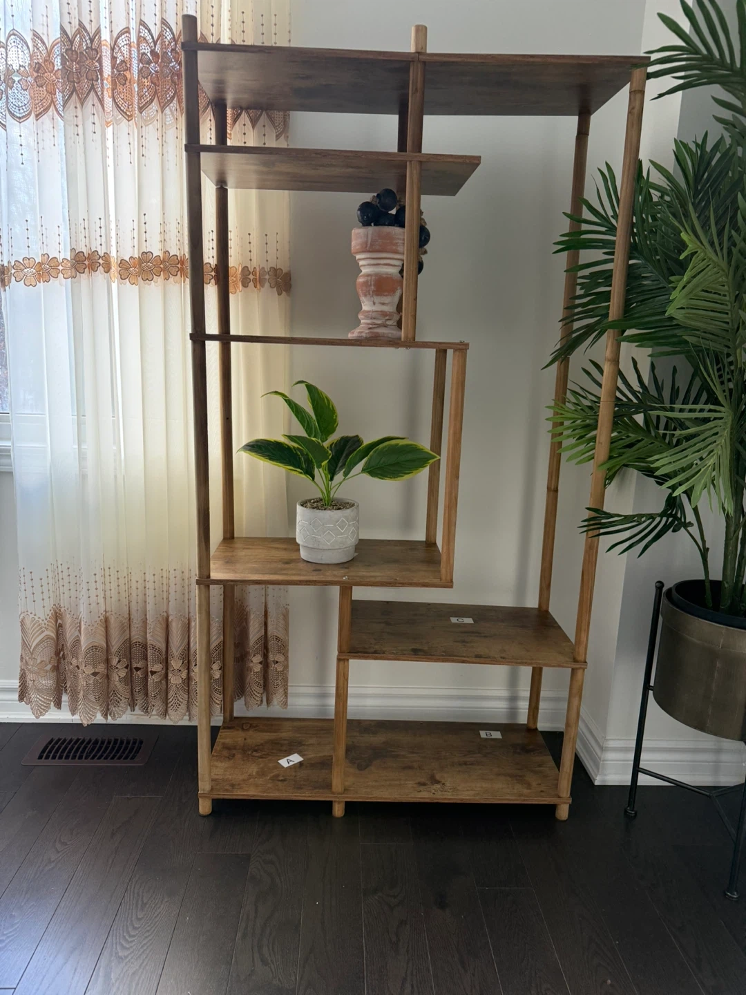 Selling a rustic brown bookshelf in great condition! This stylish bookshelf features a unique, asymmetrical design that will add a touch of modern flair to any room. Perfect for displaying books, plants, or decorative items. It's sturdy and well-maintained, ready to enhance your home decor
