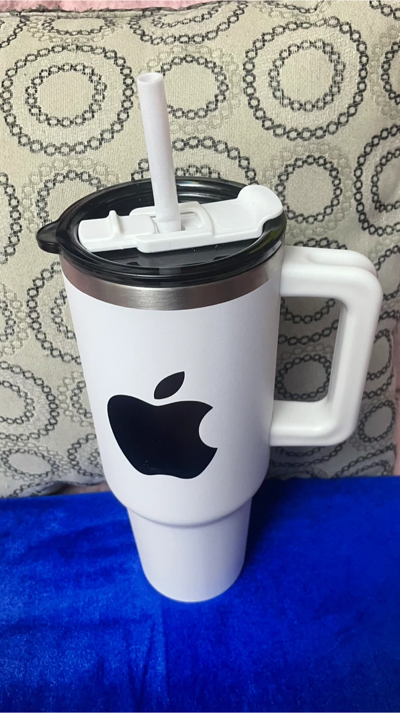 This white tumbler features a large black Apple logo. It comes with a lid and a reusable straw. Stainless steel construction. π₯