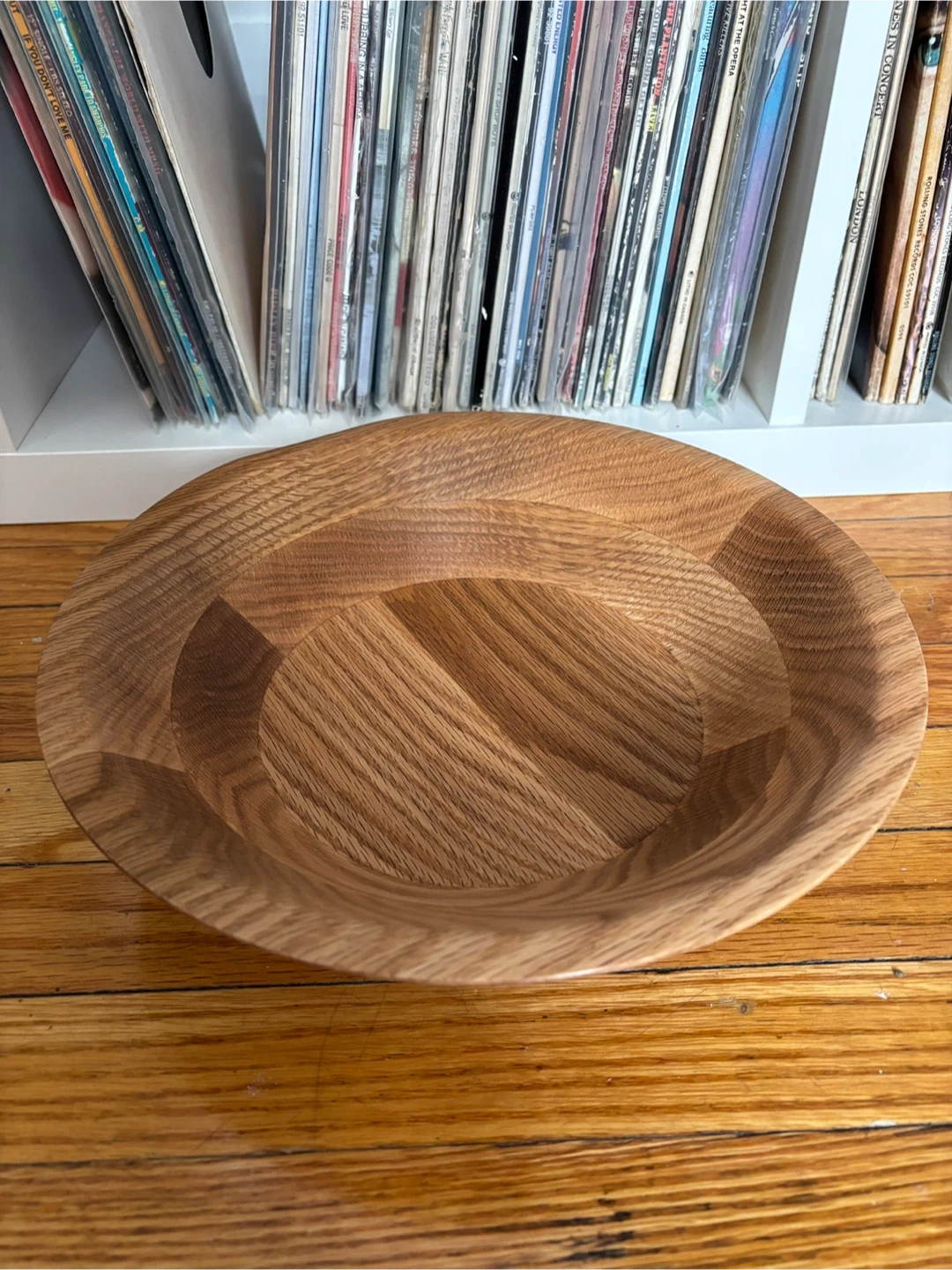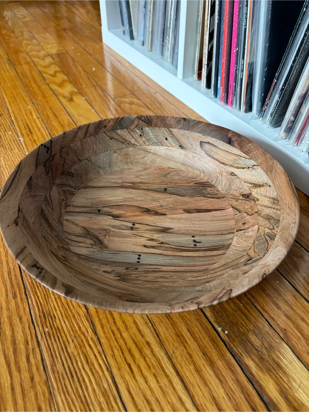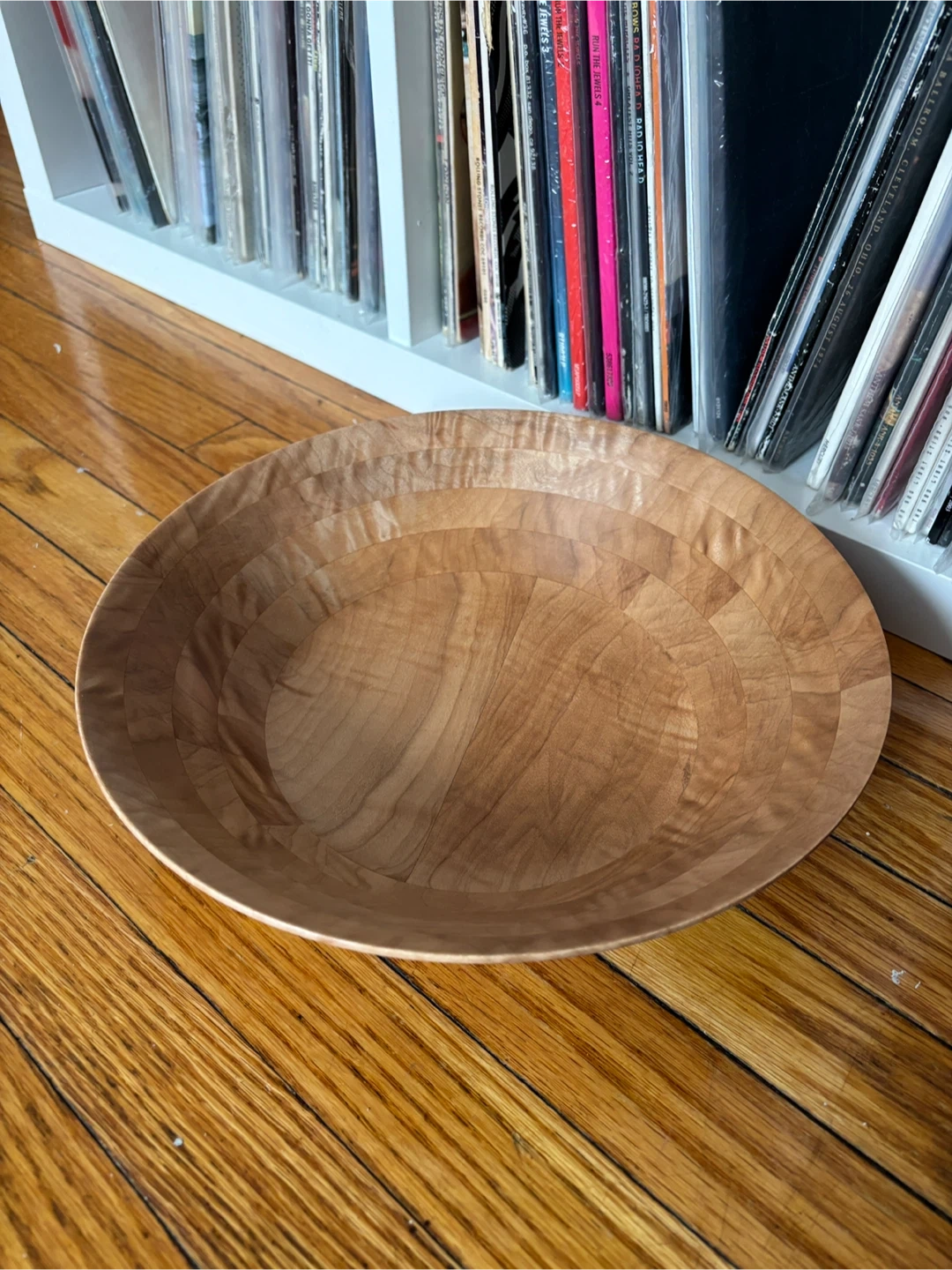2 are maple, 1 is ambrosia maple with epoxy filler, 1 is red oak, and 1 is canarywood. They’re all about 10” in diameter, except the ambrosia maple which is 11”. The canarywood is the deepest and a bit more cone shaped, the rest are shallower and have more flat bottom surface area.