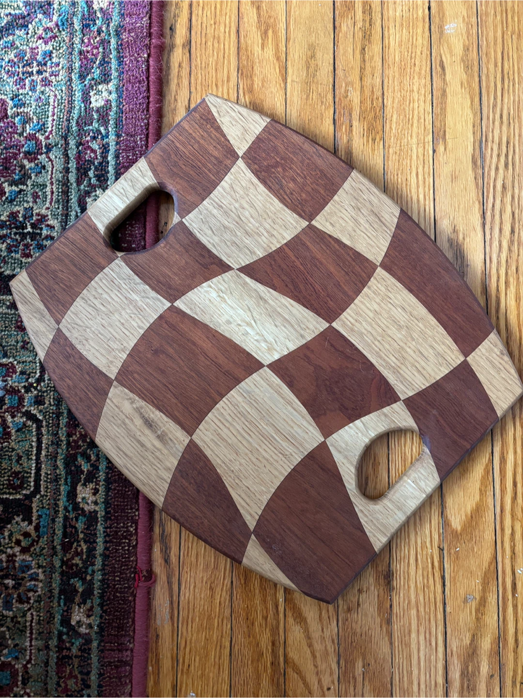 The charcuterie board is a mix of sapele and oak. It is 15” x 13”.