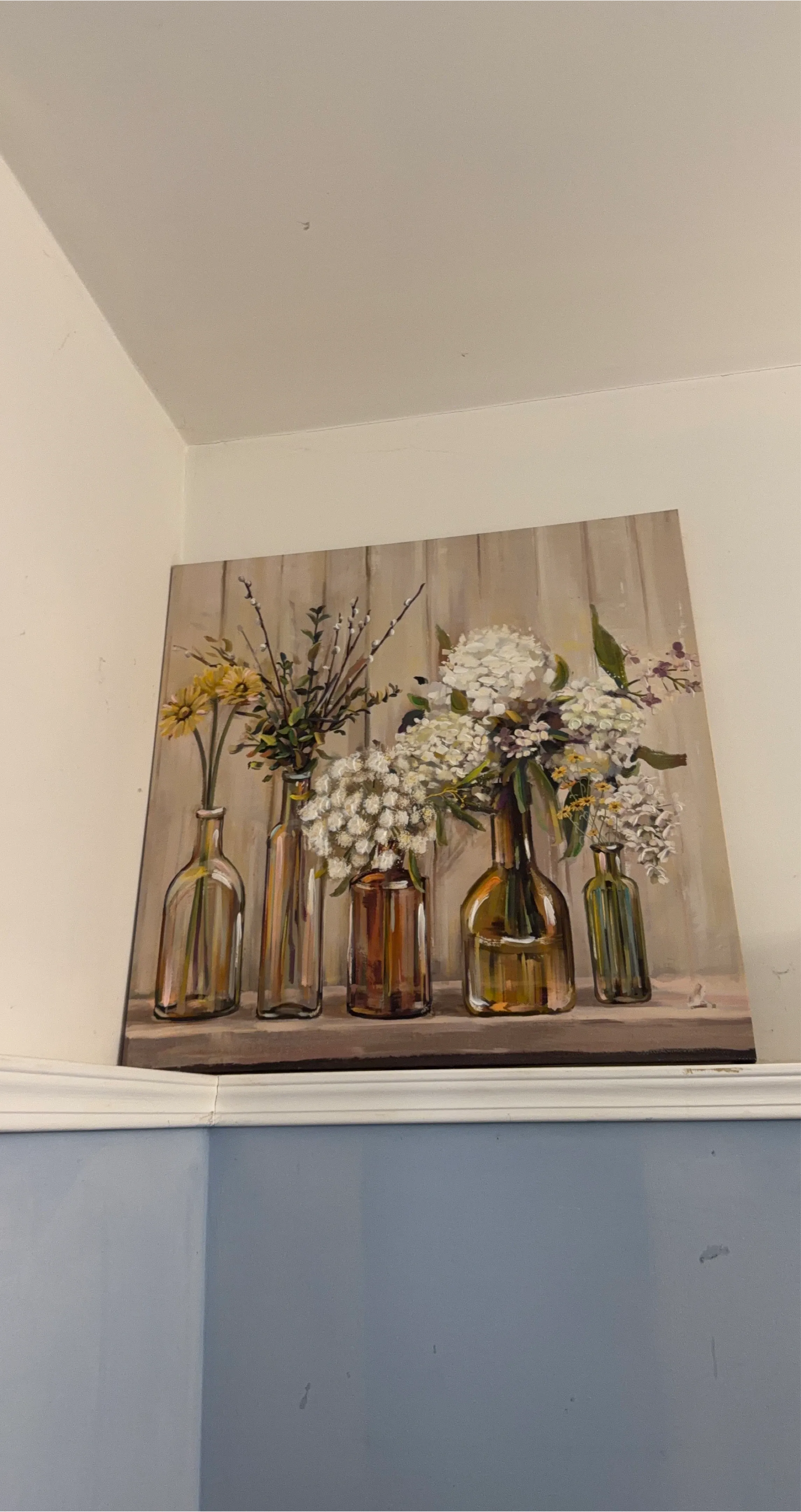 A framed canvas print showcasing five glass vases filled with various flowers and greenery. The backdrop features a distressed wood plank design. It's a lovely piece to add a touch of nature to your home decor.