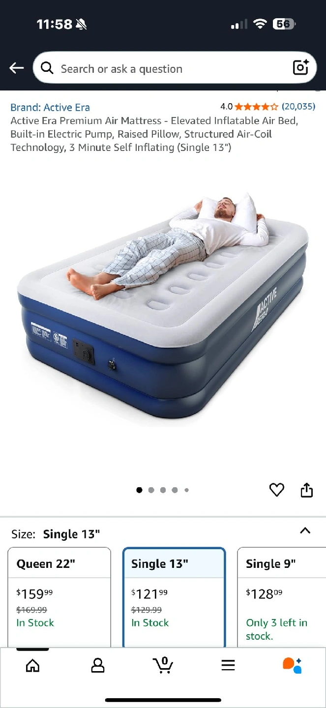 Looking to sell my Active Era premium queen size air bed. It's in great shape and comes with a built-in electric pump for easy inflation and deflation. It inflates in less than 3 minutes and has 40 structured air coils for added comfort. The box includes a travel bag for convenient storage and transportation. Dimensions are L 80" x W 60" x H 13".