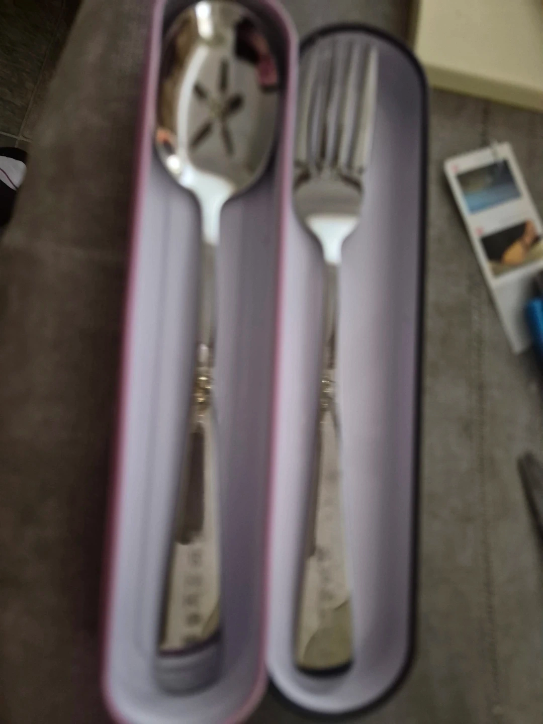 Stainless steel serving spoon and fork set. Includes a slotted serving spoon and a serving fork. Comes in a protective case.