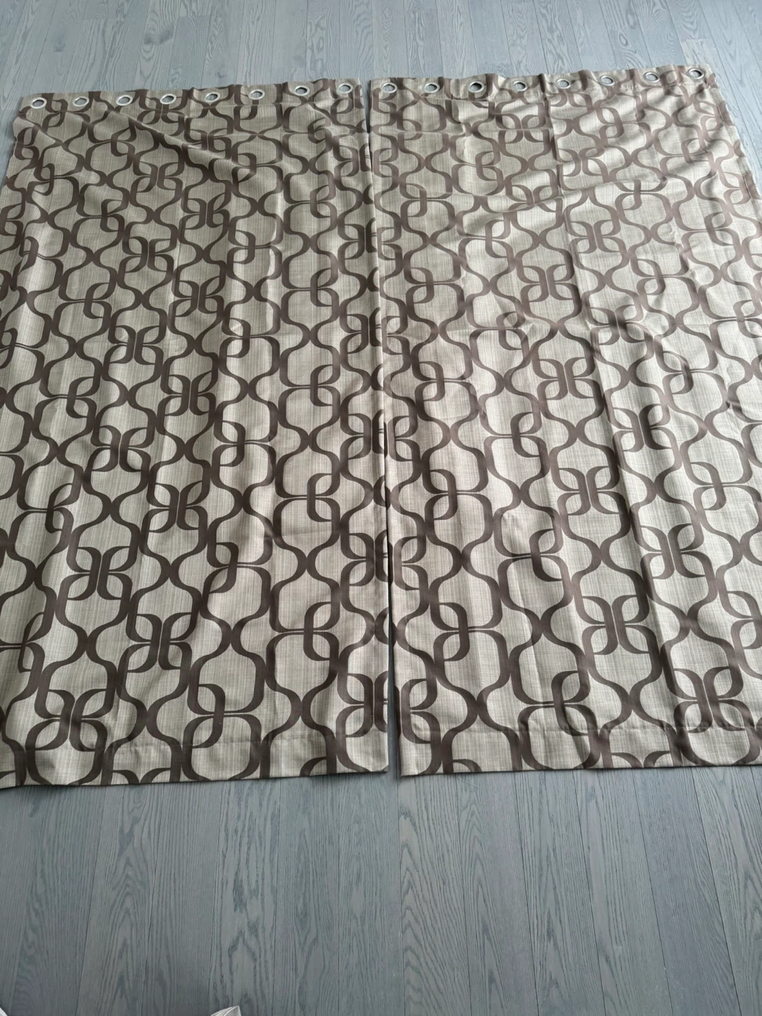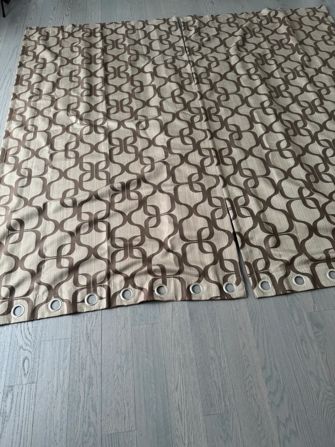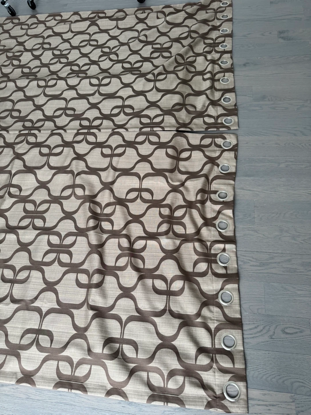 A pair of eyelet curtains featuring a repeating geometric pattern in brown on a beige background. The curtains have a white lining.