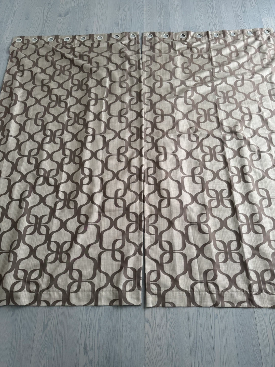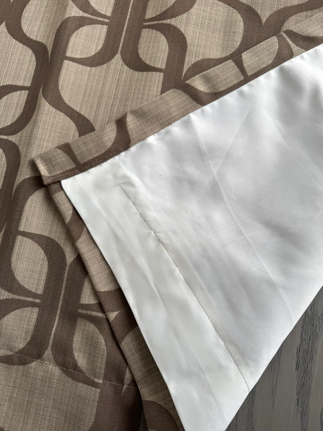 A pair of eyelet curtains featuring a repeating geometric pattern in brown on a beige background. The curtains have a white lining.