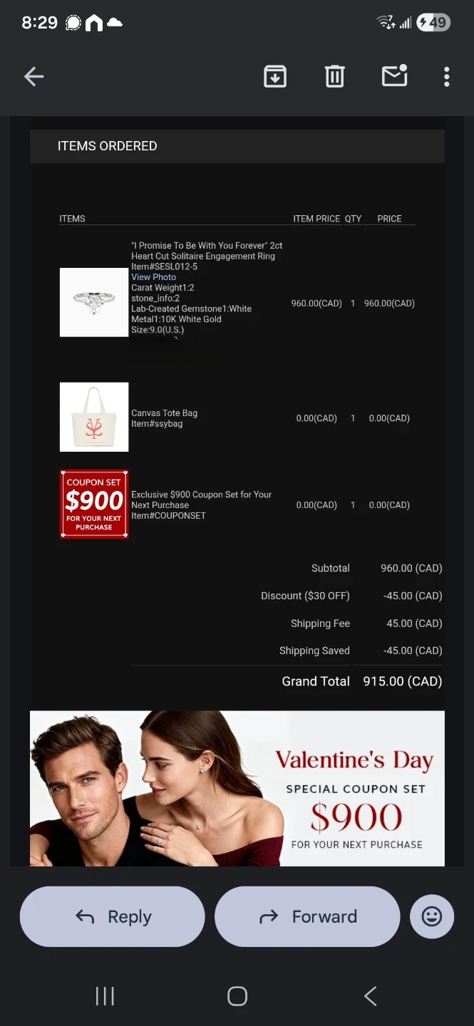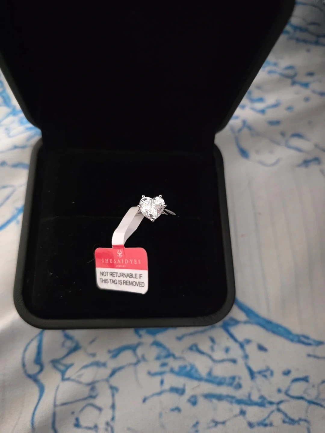 This is a beautiful heart-shaped 2kt lab-created diamond and 10k white gold band. It's a size 9 US ring. Comes in a black velvet ring box.