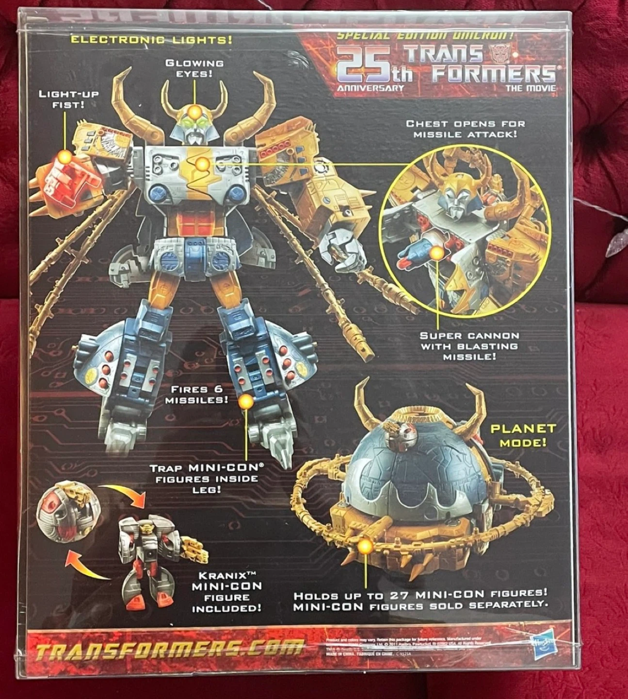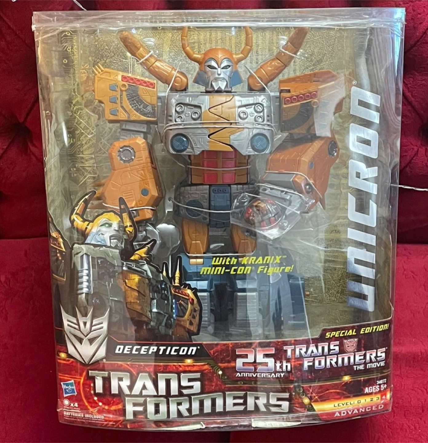 Selling a special edition Unicron Transformers figure celebrating the 25th anniversary of the movie! This Decepticon figure comes with a Kranix Mini-Con figure. The packaging highlights electronic lights, a light-up fist, and glowing eyes. The chest opens for missile attack, and it has a super cannon with a blasting missile. It can hold up to 27 mini-con figures, which are sold separately