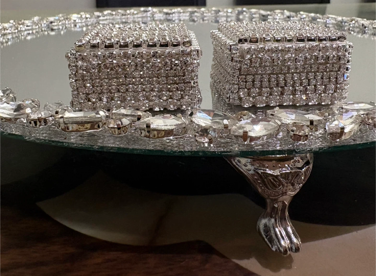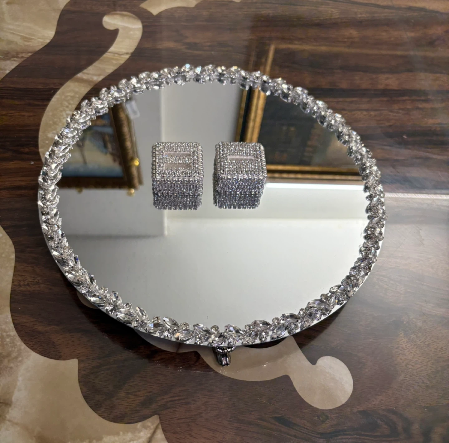 Round mirror tray with silver glass crystal rhinestone trim