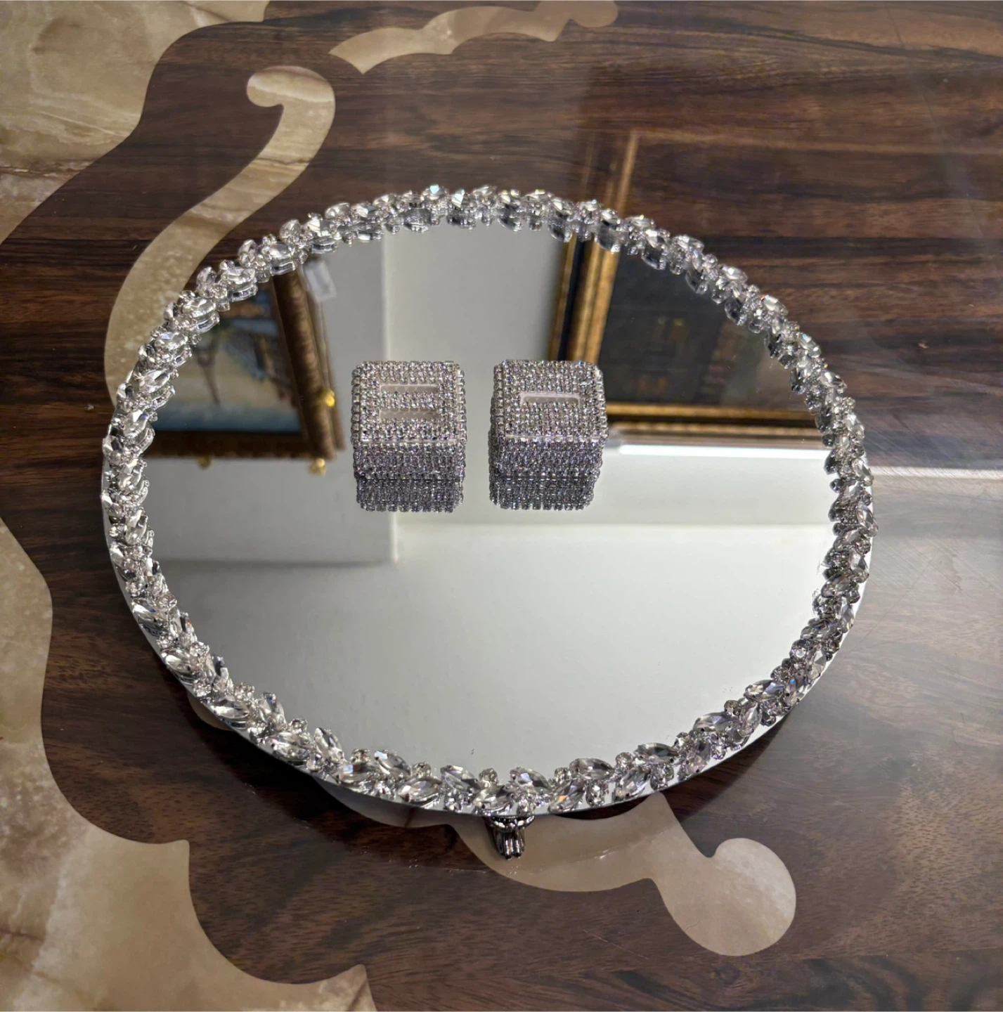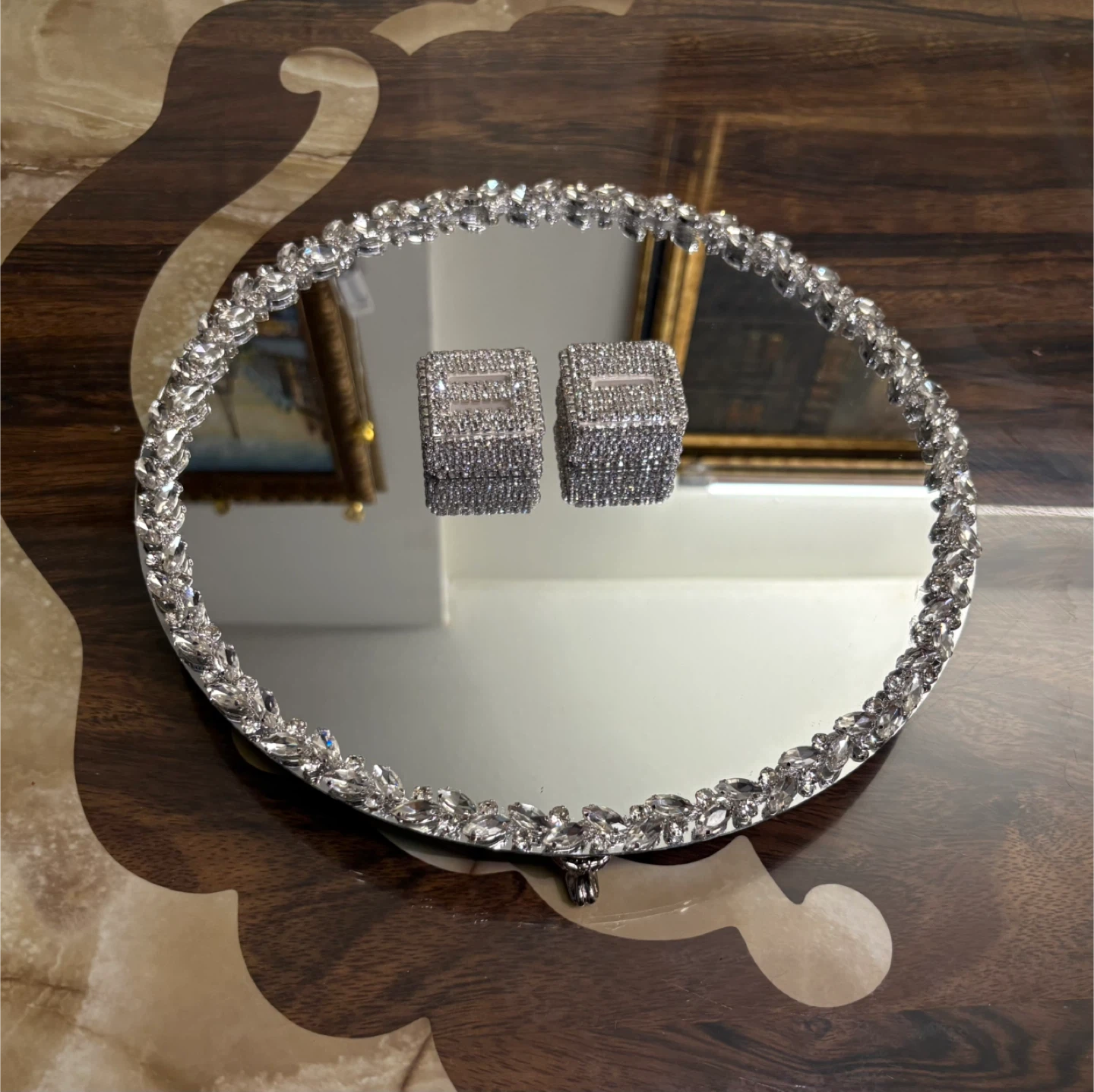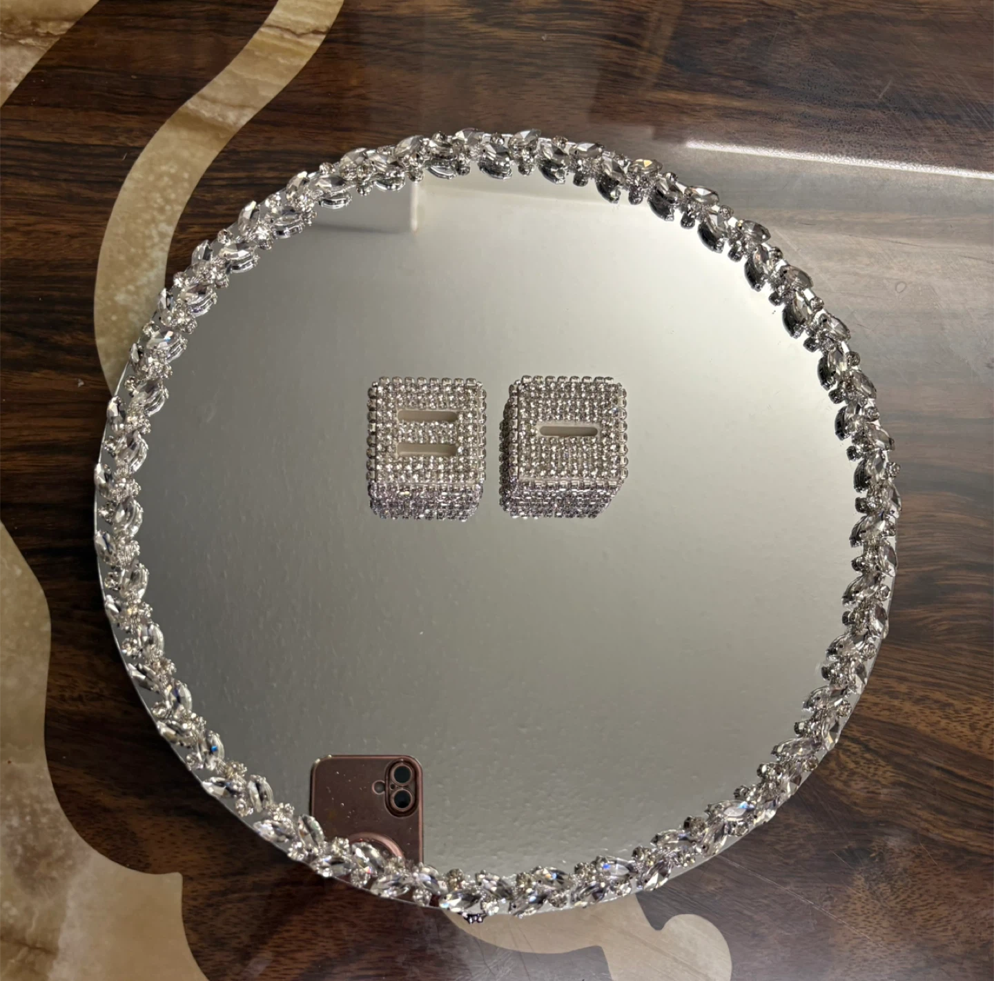 Round mirror tray with silver glass crystal rhinestone trim