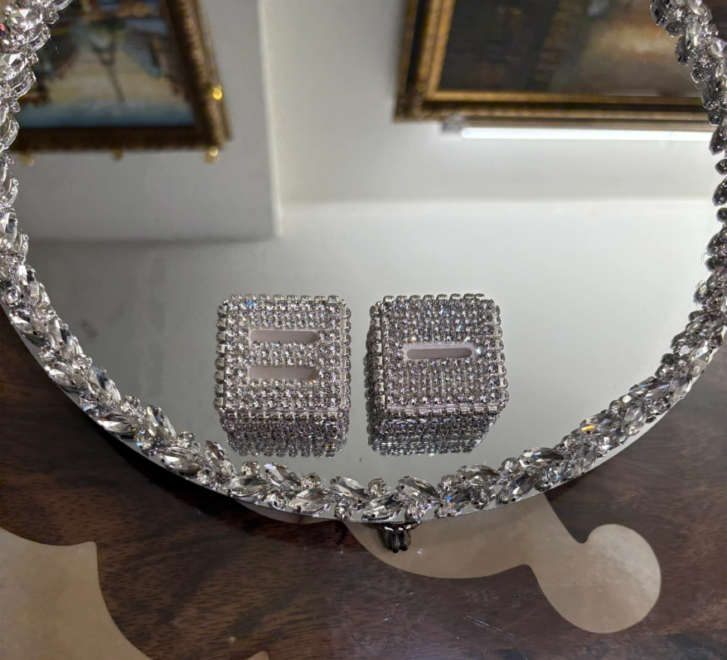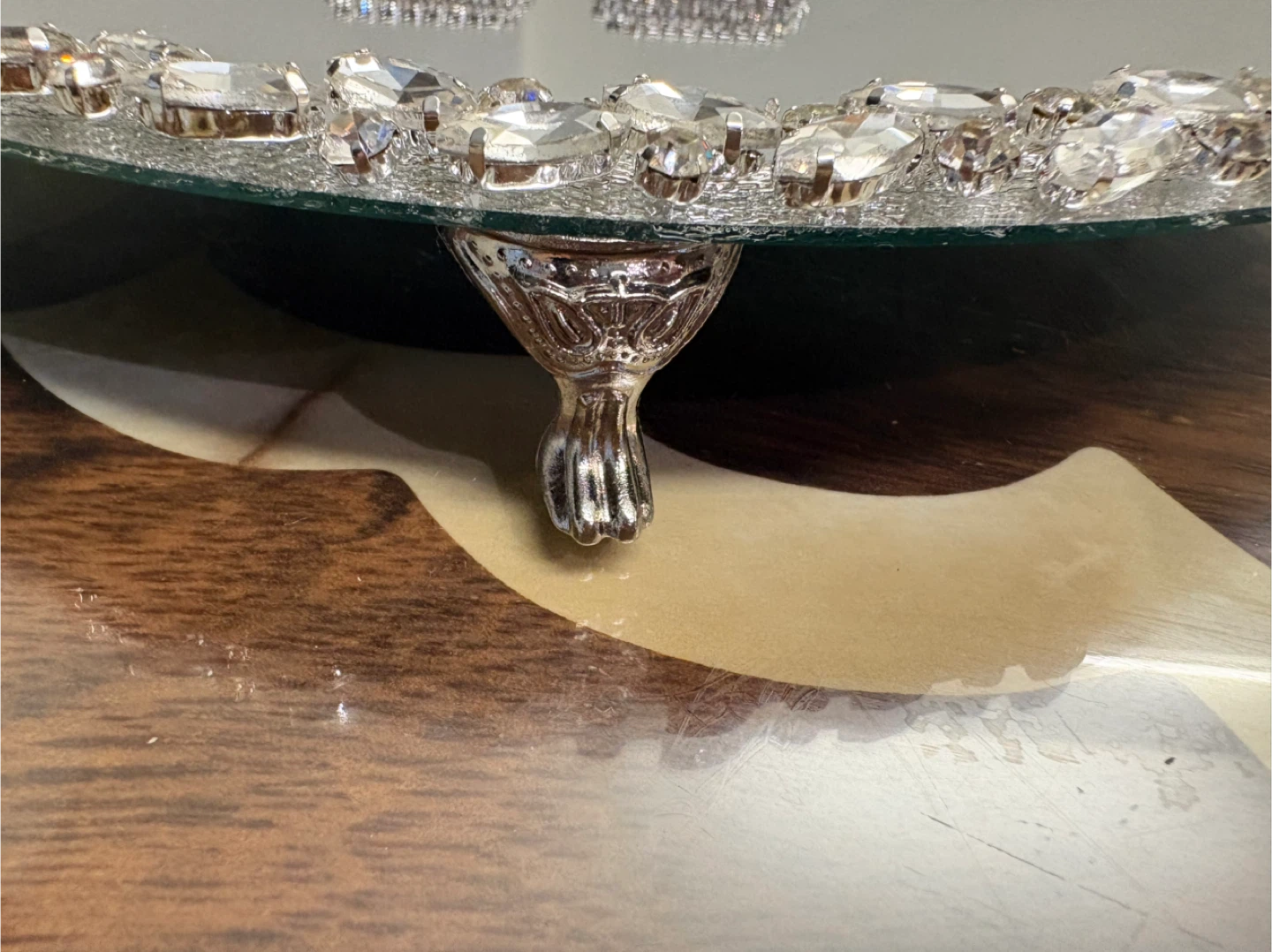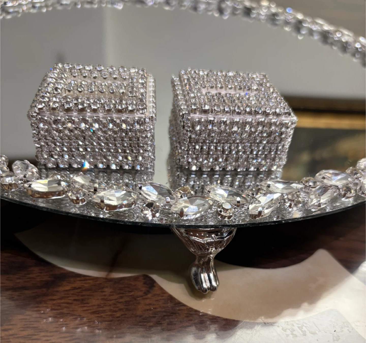 Round mirror tray with silver glass crystal rhinestone trim