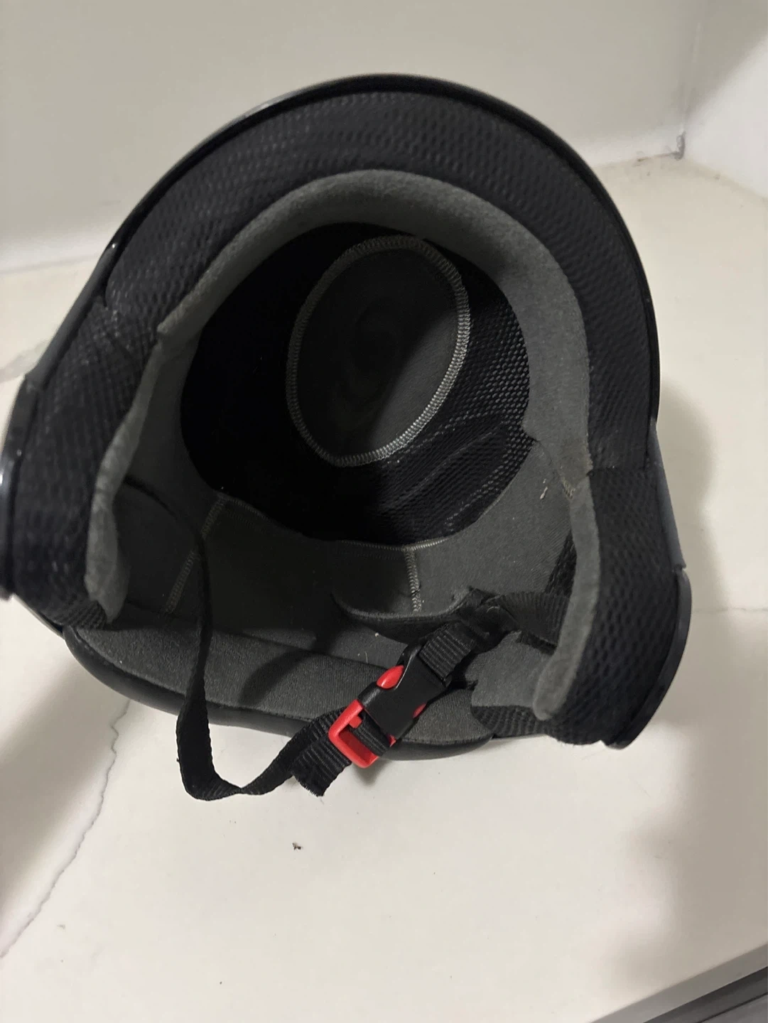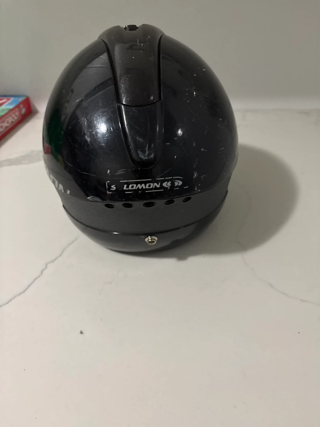 This is a black Salomon ski helmet. It has adjustable straps for a secure fit and a padded interior for comfort. Its shell is made from durable material.